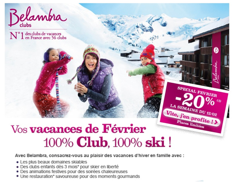 Les clubs Belambra proposent une promo intéressante pour aller skier en février : – 20% sur les prix à la semaine dans les Alpes.