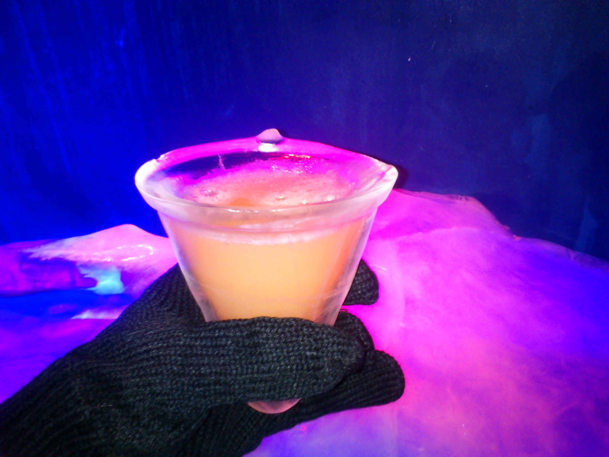Avant de pénétrer dans ce congélateur géant qu’est le Ice Kub, on a droit à un petit discours d’introduction de la barman, sans doute autant destiné à nous faire frissonner par anticipation qu’à nous mettre réellement en garde contre les dangers de l’immersion dans la froidure (-10°). Attention, attention… nous serons prévenus : la session doit durer vingt à vingt-cinq minutes, durant lesquelles on avalera autant de cocktails vodka qu’on le souhaite (ou qu’on le peut)… Quant à la barman, vêtue d’une robe du soir sans manches et décolletée, elle nous assure qu’elle est affligée d’une maladie rare qui maintient sa température corporelle, en permanence, à 39°… ce qui fait qu’elle ne souffre pas du froid. Info ou intox ? En tout cas, la jeune femme n’a pas un frisson lorsqu’elle officie derrière le bar de glace où elle passe ses soirées aussi court vêtue qu’elle le serait à St Tropez.