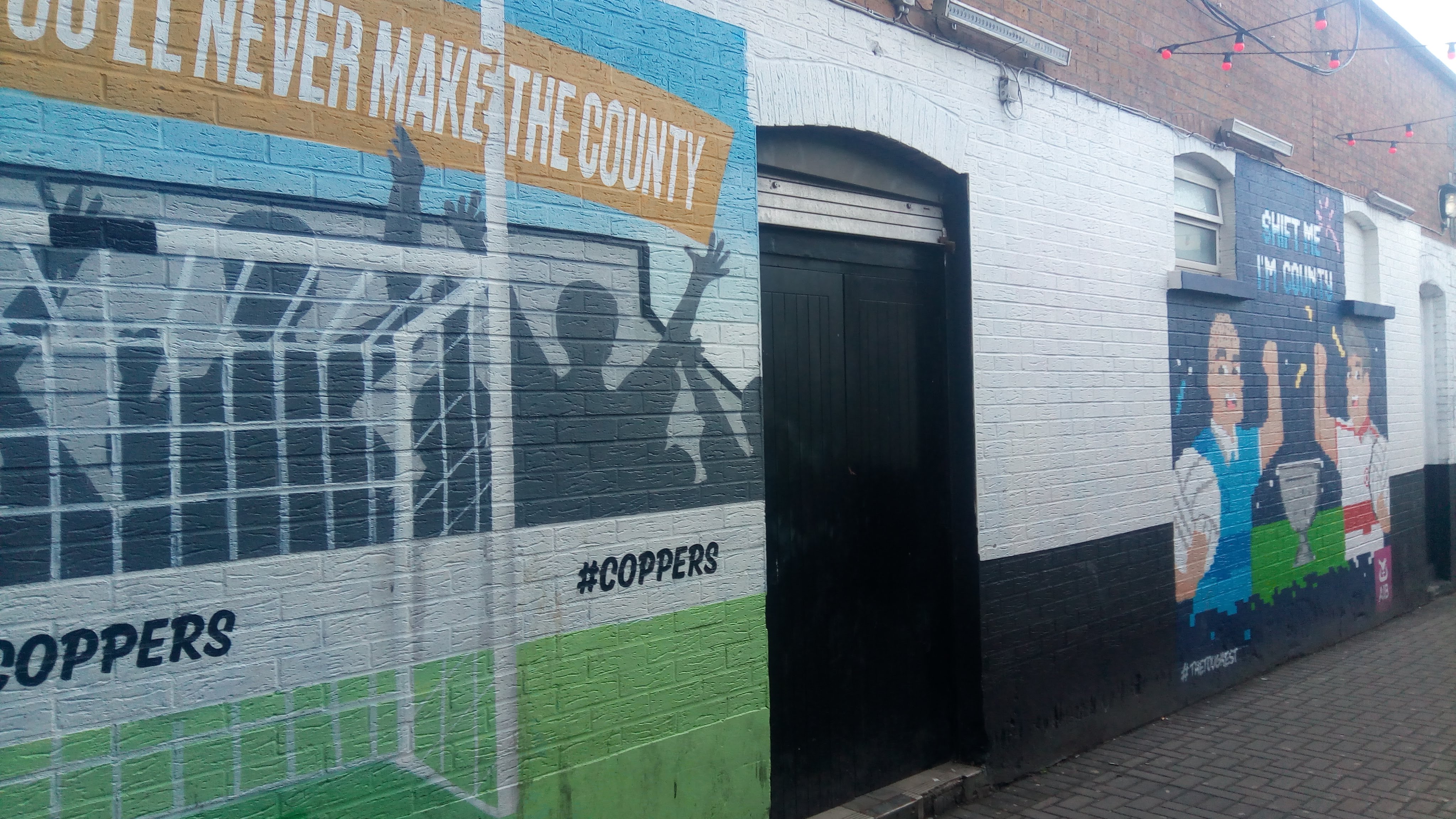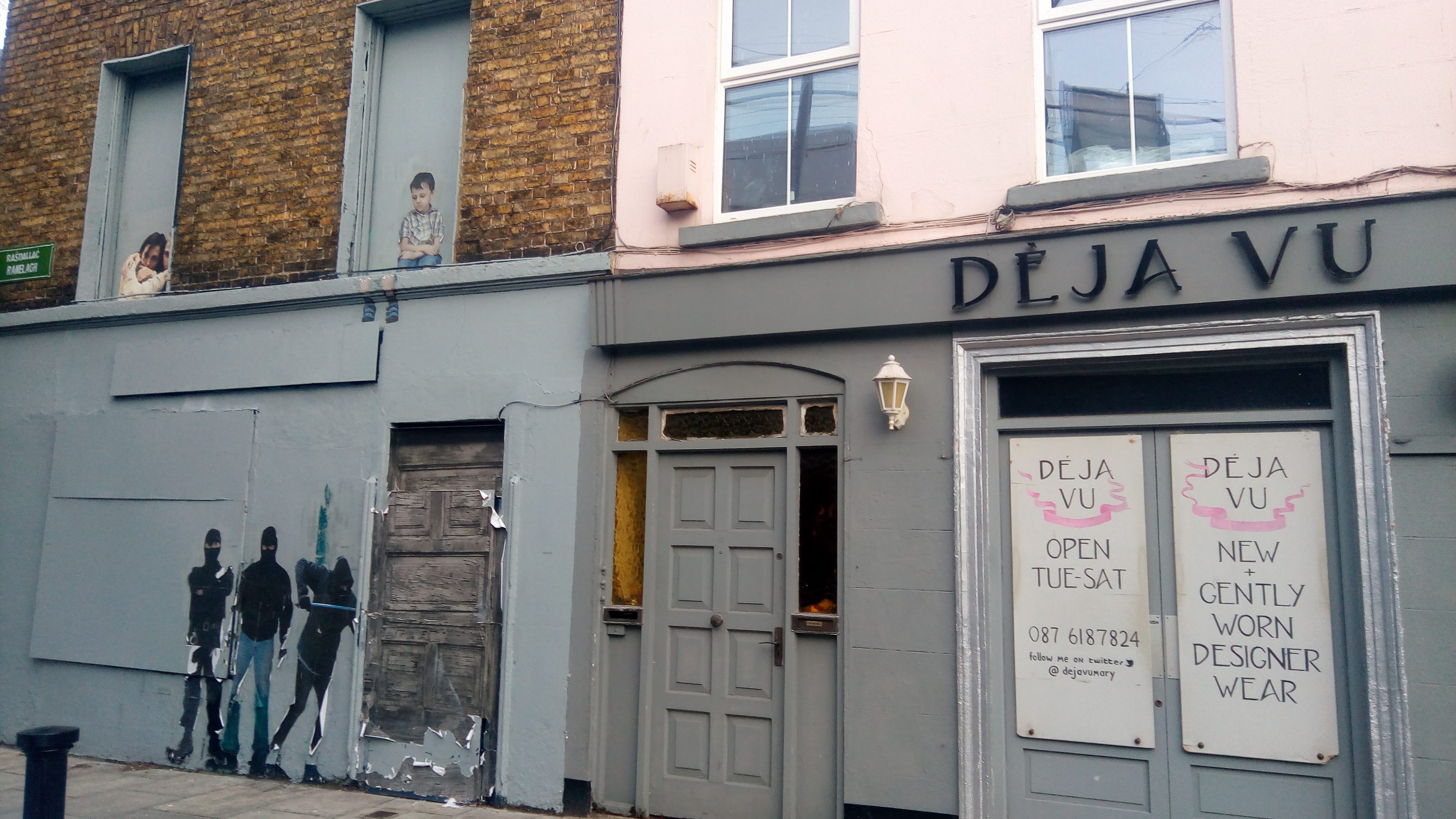 Des monte-en-l’air plus vrais que des vrais, sur le mur effrité d’un quartier populaire, Frederick Street… Renseignements pris, il s’agit d’une maison abandonnée, à laquelle un collectif d’artistes, SUBSET, a donné une touche d’humour dans le cadre du projet Grey Area : il s’agit d’apporter des couleurs aux murs de Dublin et d’opposer l’art de rue à la misère. Les artistes organisent des expositions (la deuxième a eu lieu en octobre dernier) et proposent à la vente des impressions sur toile de leurs oeuvres. Tous les bénéfices sont reversés aux sans-abris de Dublin. Une belle initiative, que vous pouvez soutenir en achetant une toile ici (à partir de 30 euros).