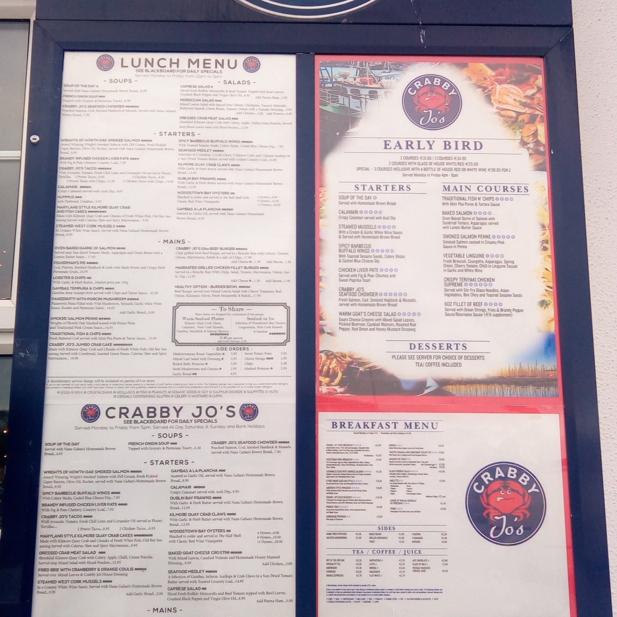 On se fie à un bon critère : la queue qui se forme devant… celle qui stagne à l’entrée du Crabby’s Jo est de très loin la plus longue, tant pour aller manger à l’intérieur (d’ailleurs, il est trop tard, c’est plein) que pour prendre un fish and chips à emporter. L’heure du lunch est déjà passée mais les horaires sont souples, à l’anglo-saxonne, et quand le lunch est fini, on embraye sur le “early bird” (un dîner en happy hour) puis sur le menu du soir à partir de 20H… comme c’est pratique, d’aller manger dans les pays qui ne pratiquent pas la rigidité maniaque des pays latins sur les horaires du sacro-saint déjeuner, et ne ferment pas leur cuisine entre 14 et 19 heures !
