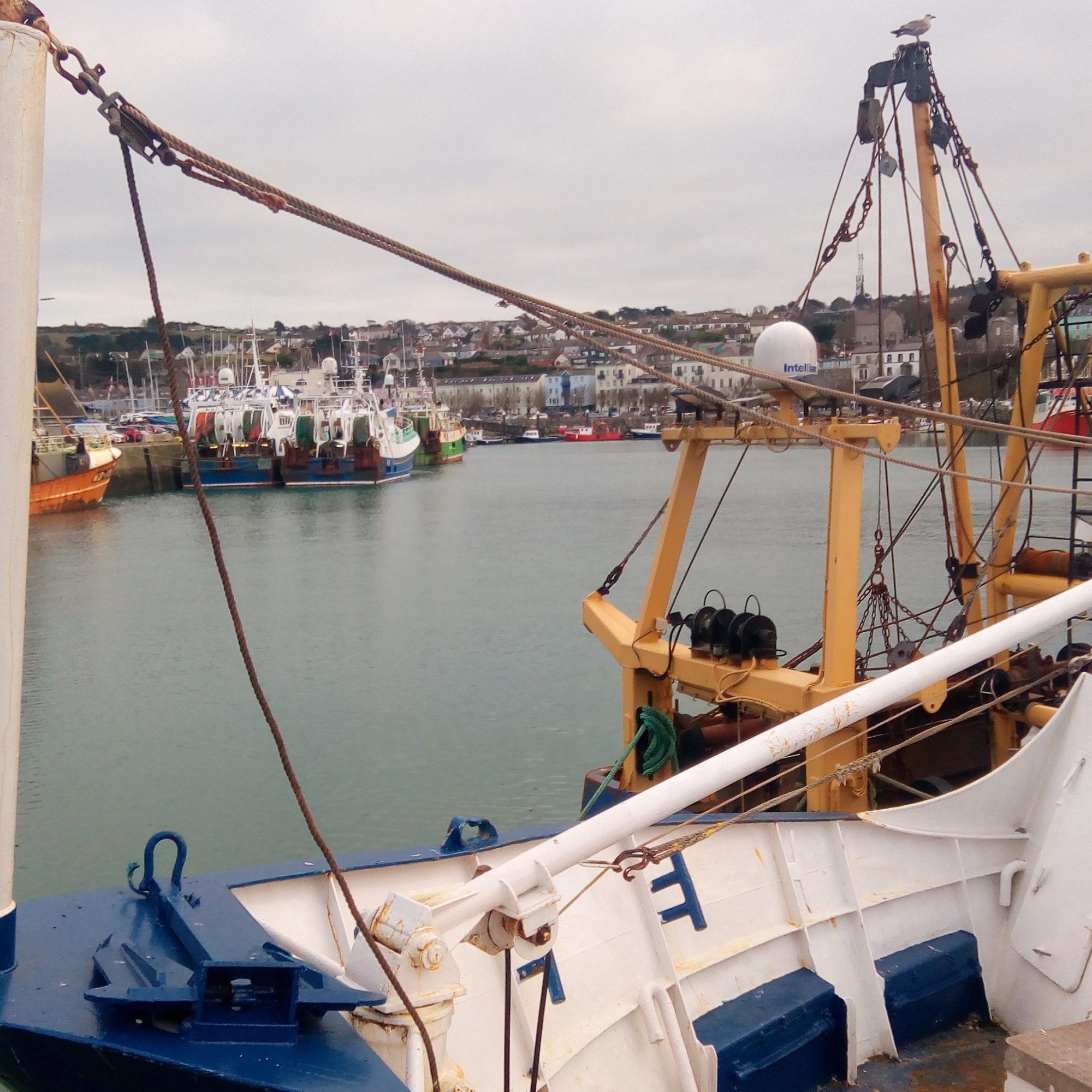 De belles façades – anciennes maisons de pêcheurs prospères – et d’autres plus modestes – maisonnettes de pêcheurs traditionnelles, sans doute devenues très recherchées sur le marché immobilier – forment une mosaïque de couleurs, à l’anglo-saxonne, avec des portes d’entrée alternant les bleus, roses, jaunes, rouges ou violets – selon les goûts des propriétaires, sans doute. A moins qu’il n’existe, ici et dans la plupart des villes irlandaises, écossaises ou anglaises, des accords entre voisins pour réussir ces beaux dégradés de coloris assortis, parfois claquants, parfois pastels – tu peins en bleu foncé, je peins en bleu clair, et le suivant osera un beau turquoise… ? Il faudra un jour que je pose la question à un natif d’Albion !