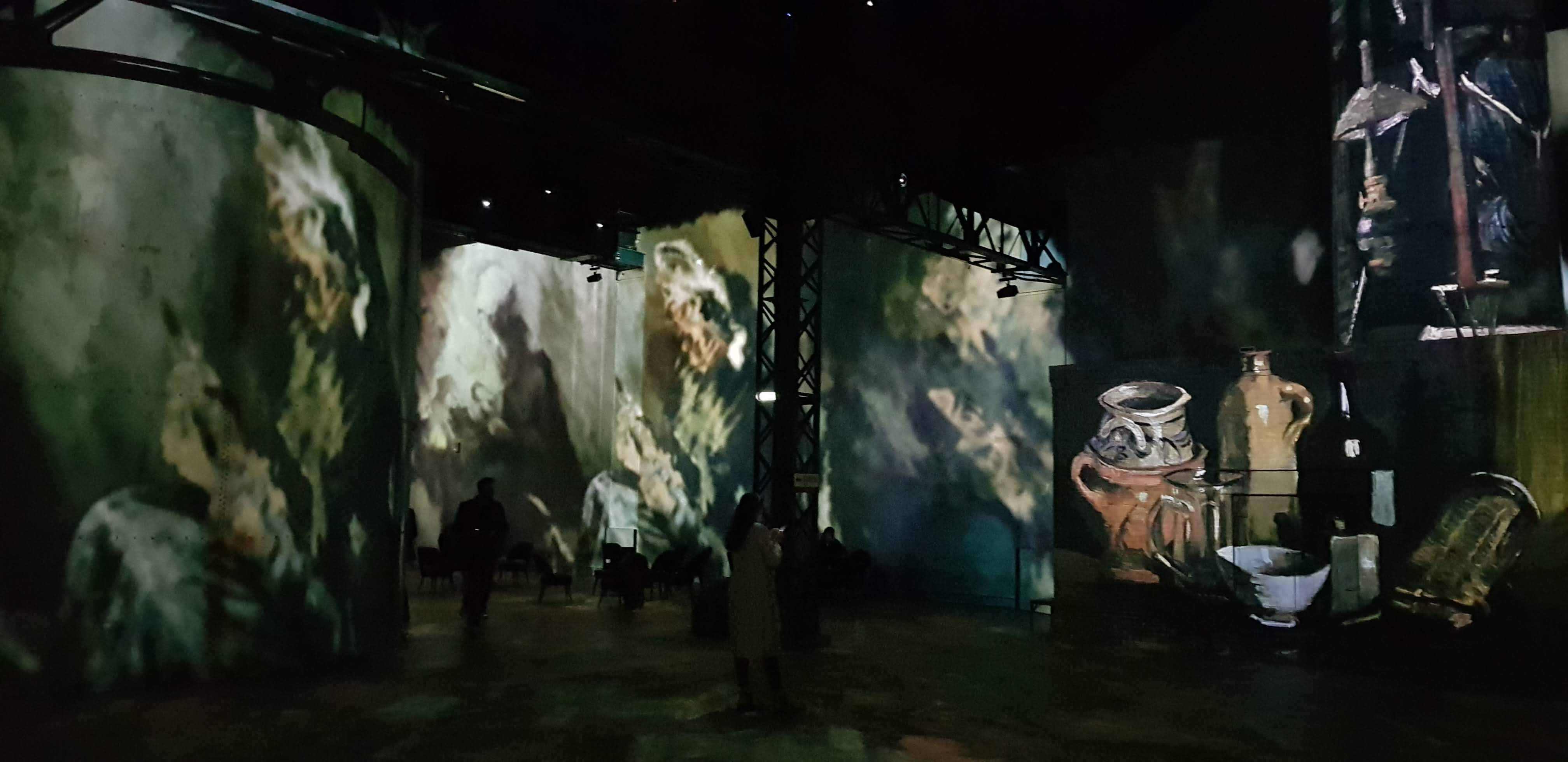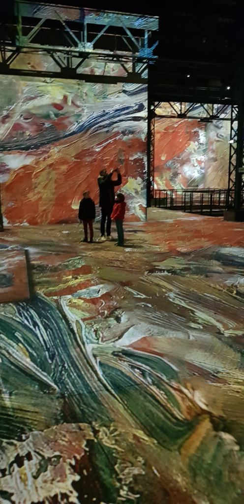 Ici, on visite l’oeuvre de l’artiste sans jamais voir la moindre de ses toiles « pour de vrai ». On est pourtant environné de son talent, de façon spectaculaire; on découvre les tableaux, mais aussi l’époque, l’univers de Van Gogh, du Paris du XIXème siècle, avec des photos d’époque, à la Provence, entre Arles et Saint-Rémy, parmi les tournesols et des champs de lavande…