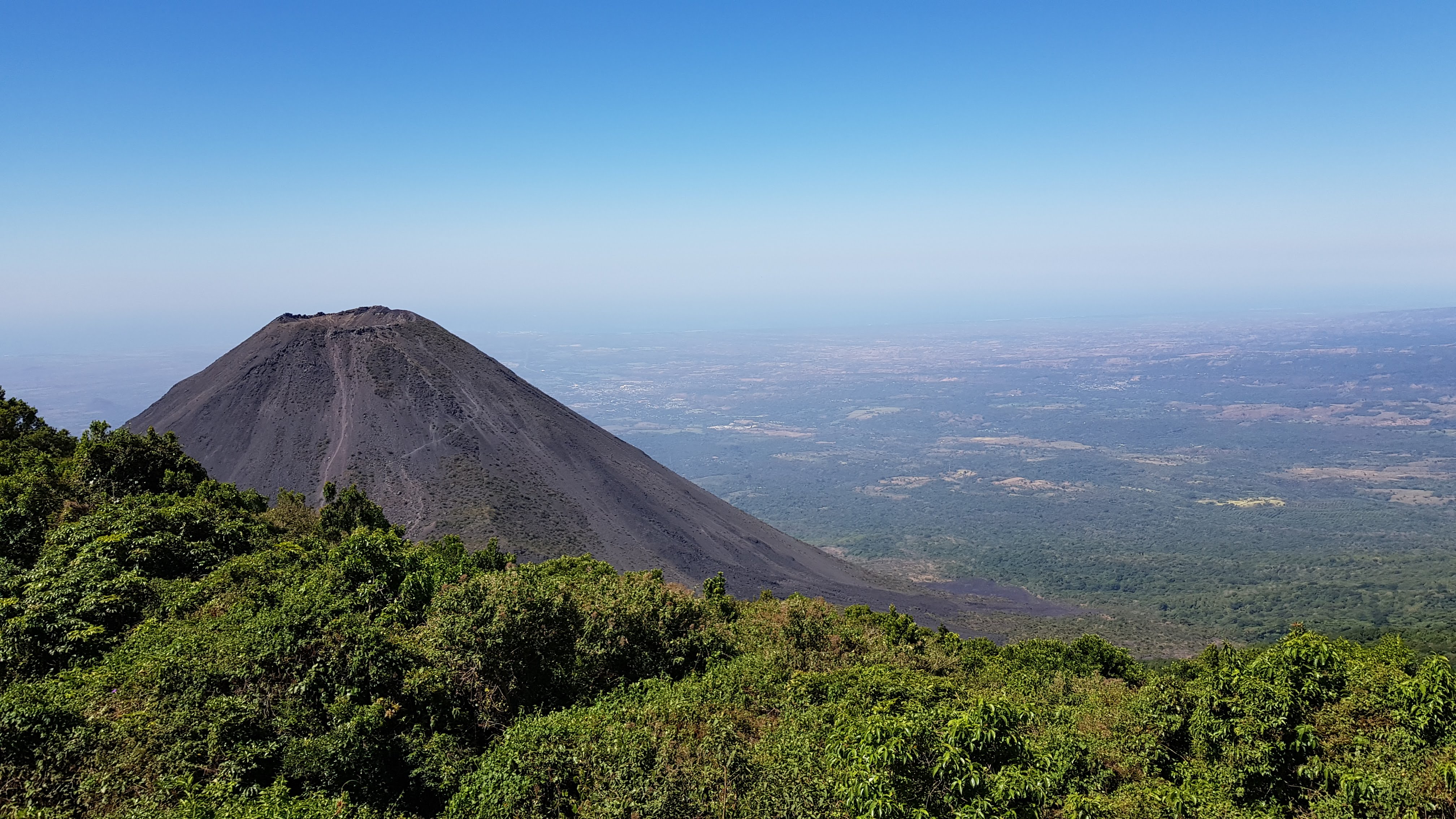 Quoique relativement petit (26 km2) surtout au regard des grands lacs guatémaltèques dont le fameux lac Attitlàn (dont je vous reparlerai, il fait partie de la suite du voyage !) le Coatepeque est magnifique avec ses contours escarpés et la crète volcanique qui l’enserre. En y allant, on peut l’admirer du pied du Cerro Verde, un volcan éteint qui donne aussi son nom au parc national, dans lequel on pénètre pour grimper jusqu’à l’autre volcan célèbre du pays, le Santa Ana. Celui-ci, le plus haut du Salvador, peut être gravi : on y admire, au sommet, un splendide panorama et un cratère bleuté. Malheureusement, je n’ai pas eu le temps d’entreprendre cette ascension, qui est régie par les règles strictes de la police touristique (une création du ministère du Tourisme pour sécuriser et encourager celui-ci, le Salvador souffrant encore beaucoup de son image de pays dangereux). Donc, on ne monte pas comme on veut, ni quand on veut : il faut venir à 11H le matin, payer sa dîme à un guide officiel et entreprendre l’ascension à ses côtés, avec escorte policière (ce qui nous a un peu découragés, d’autant que le temps nous était compté, et pas facile de s’organiser entre ces horaires de visite et ceux des transports, rares, compliqués, chers.) On monte pendant deux heures, on peut faire un pique-nique au sommet, et on se retrouve en bas à 15H.