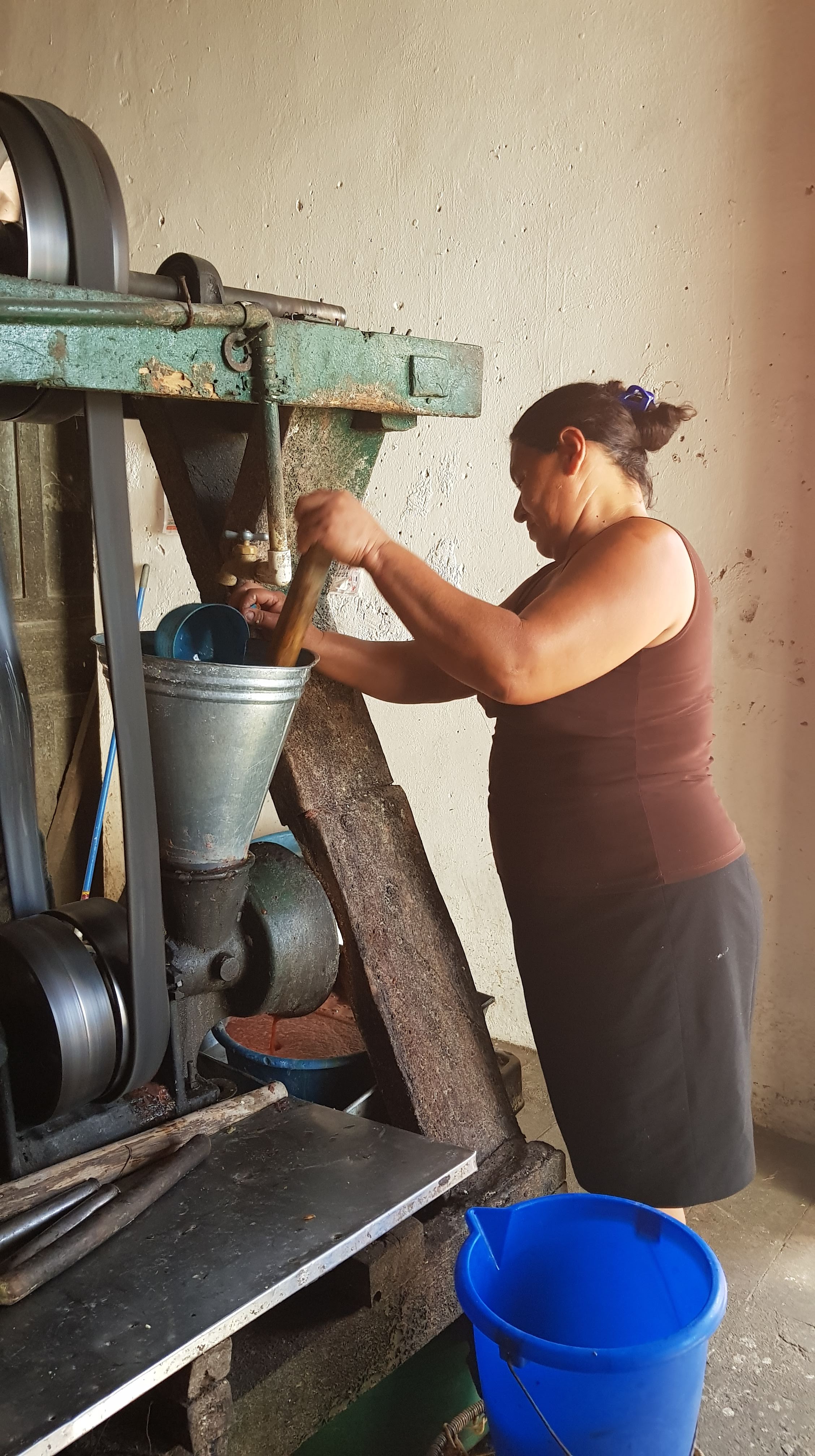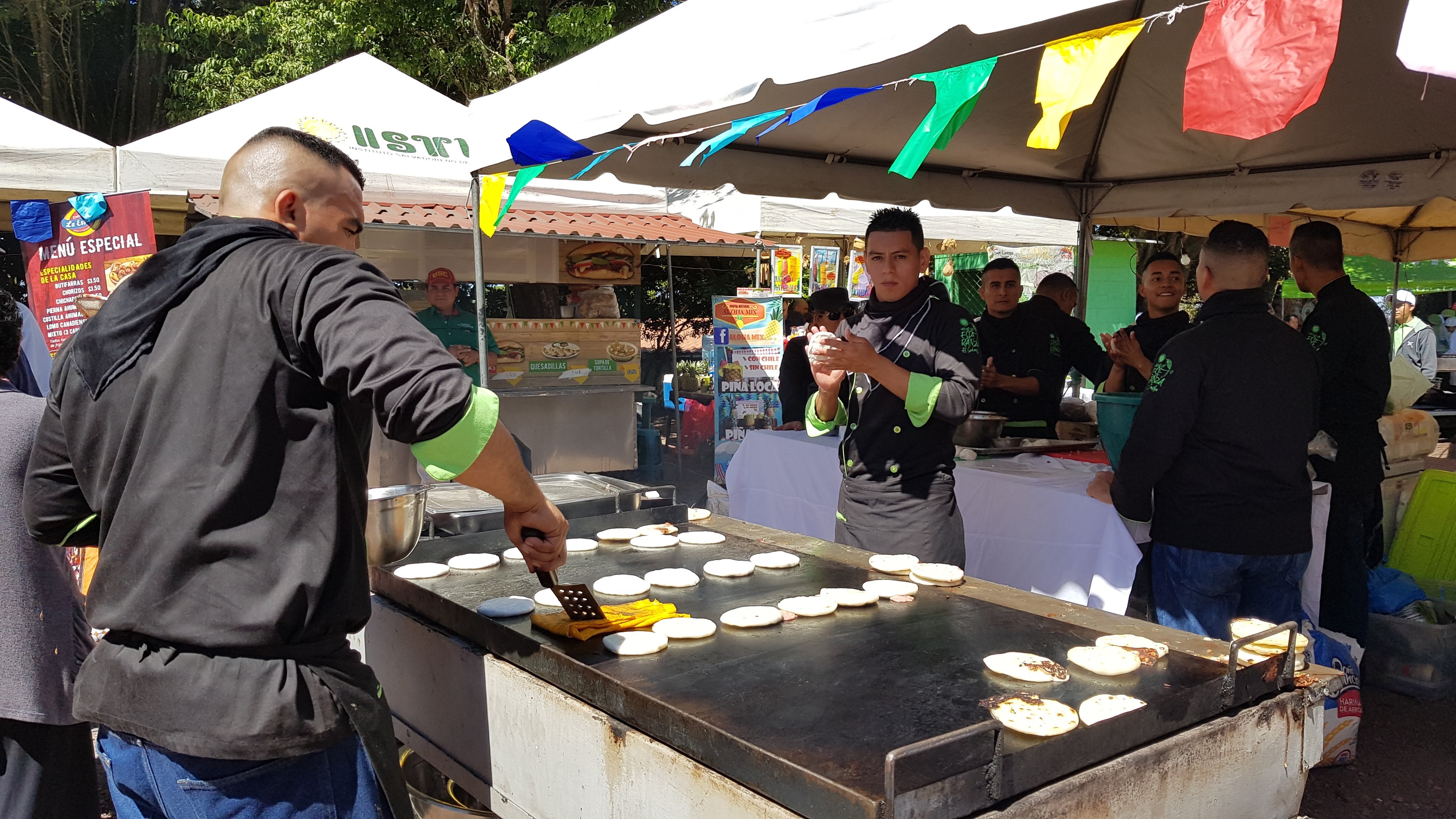 A propos de « pupusas » – on peut acheter partout, au bord des routes, dans des food trucks, des restos, des cafés, sur les places, ces sortes de tortillas de maïs, fourrées à la pâte de haricots noirs, à la viande hachée, au fromage, au poisson, puis cuites sur une grande plancha – vous pouvez faire une visite intéressante à Conception de Atàco, une jolie ville très colorée qui se trouve sur la « route des fleurs », en allant vers le Guatemala. On y trouve en effet une sorte de moulin municipal où on confectionne la pâte, à base de farine de maïs, et la sauce, à base de tomates, qui constituent les ingrédients essentiels des « pupusas ». A observer…