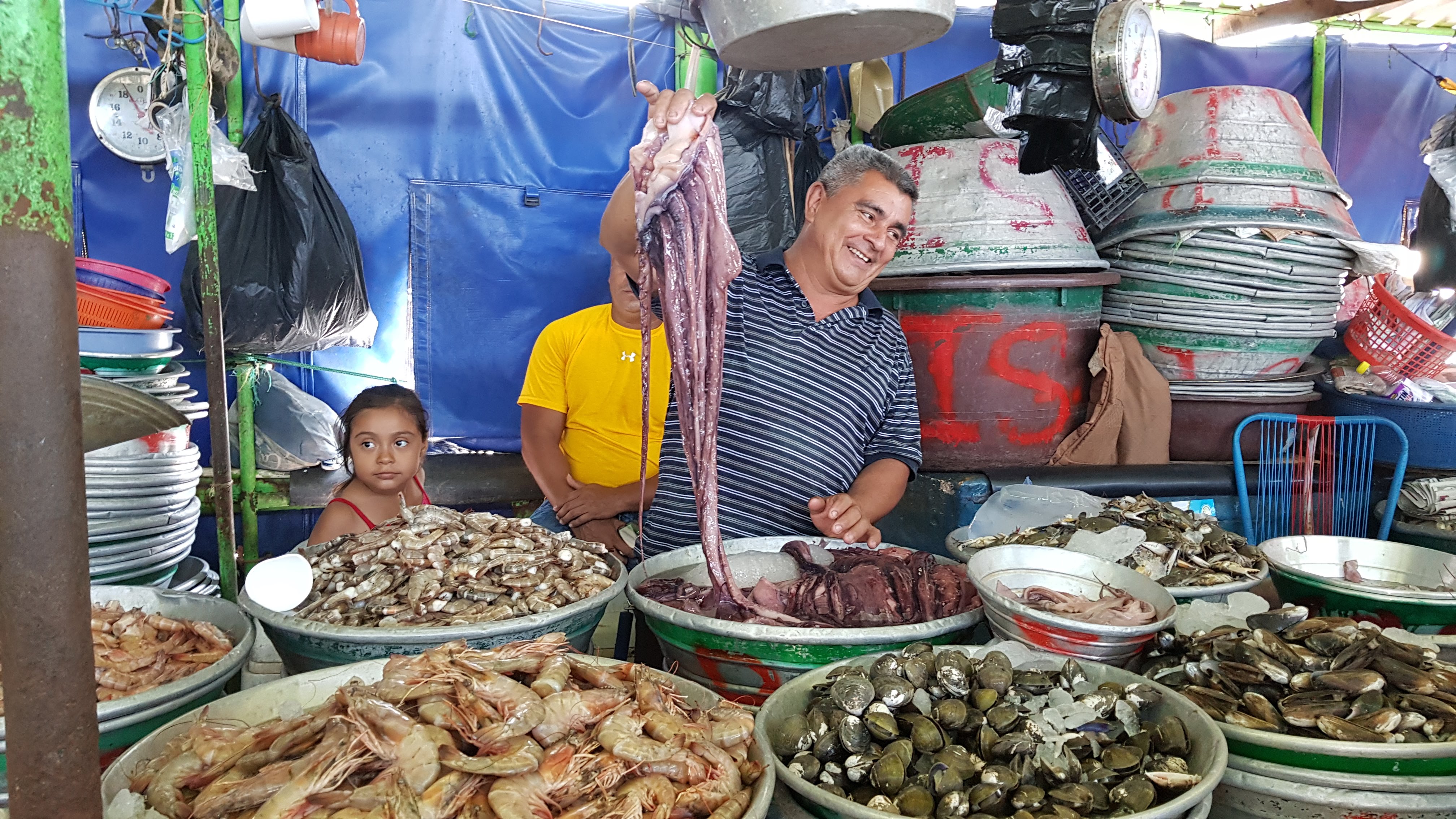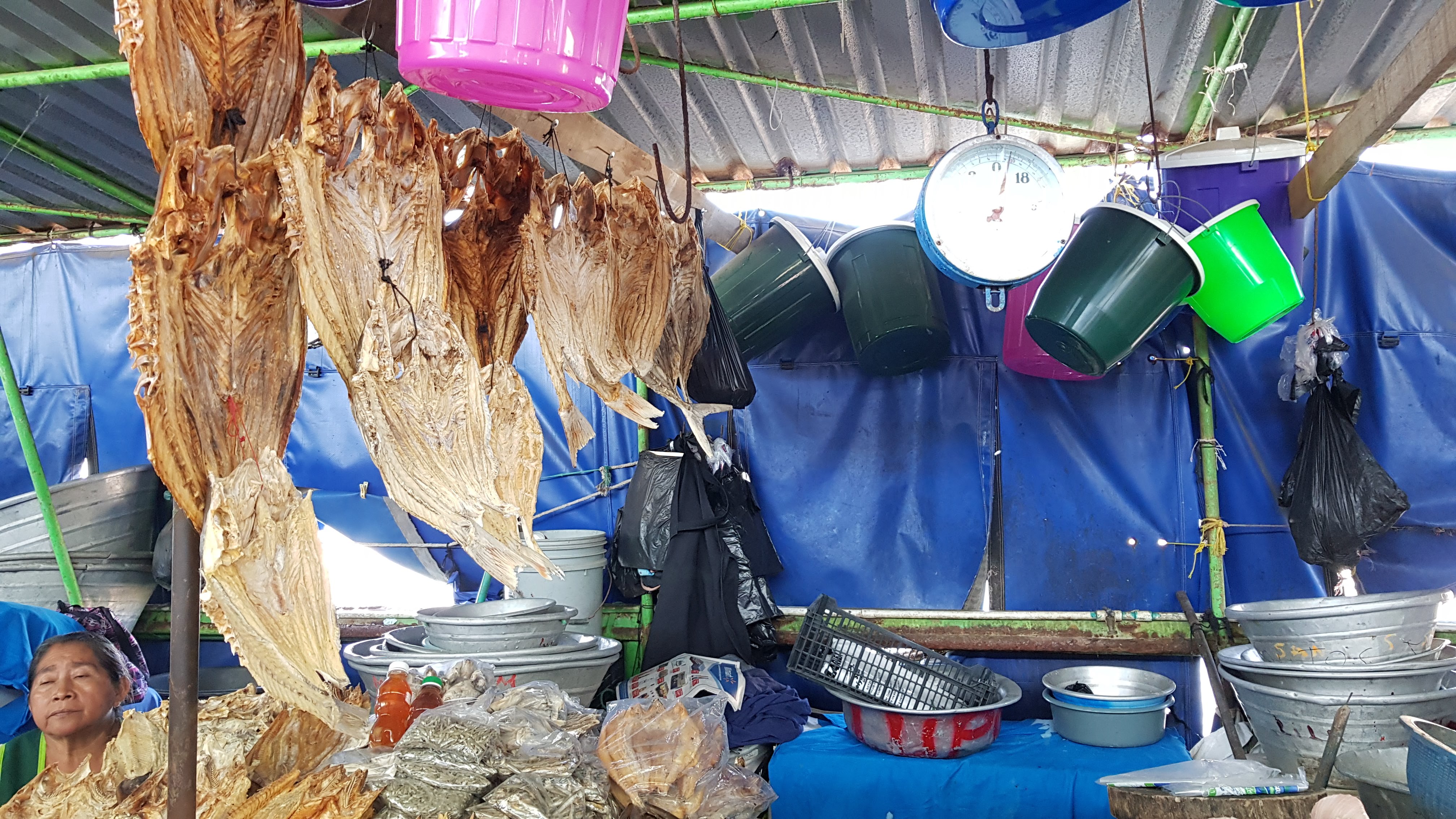 Dans une ambiance extraordinaire, sous la halle bleue du marché aux poissons, on peut acheter des coquillages, de belles langoustes et des poissons frais ou séchés, suspendus aux étals.