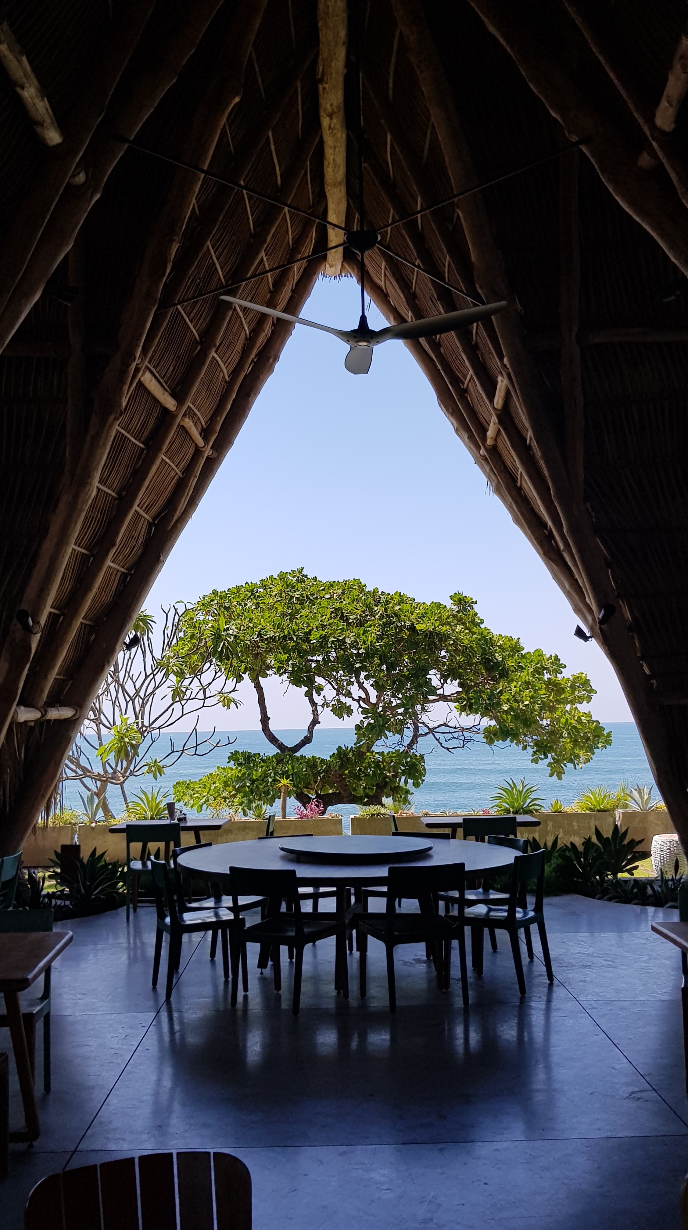 L’une des plus belles pièces est la salle de yoga, dont les fenêtres offrent un incroyable panorama à 365 degrés. La salle à manger extérieure, comme une hutte géante, s’ouvre sur tous les côtés sur la nature : on y mange sous l’ombre bienfaisante de son haut toit de palmes, dans la fraîcheur délicieuse de la brise qui s’engouffre par ces ouvertures.