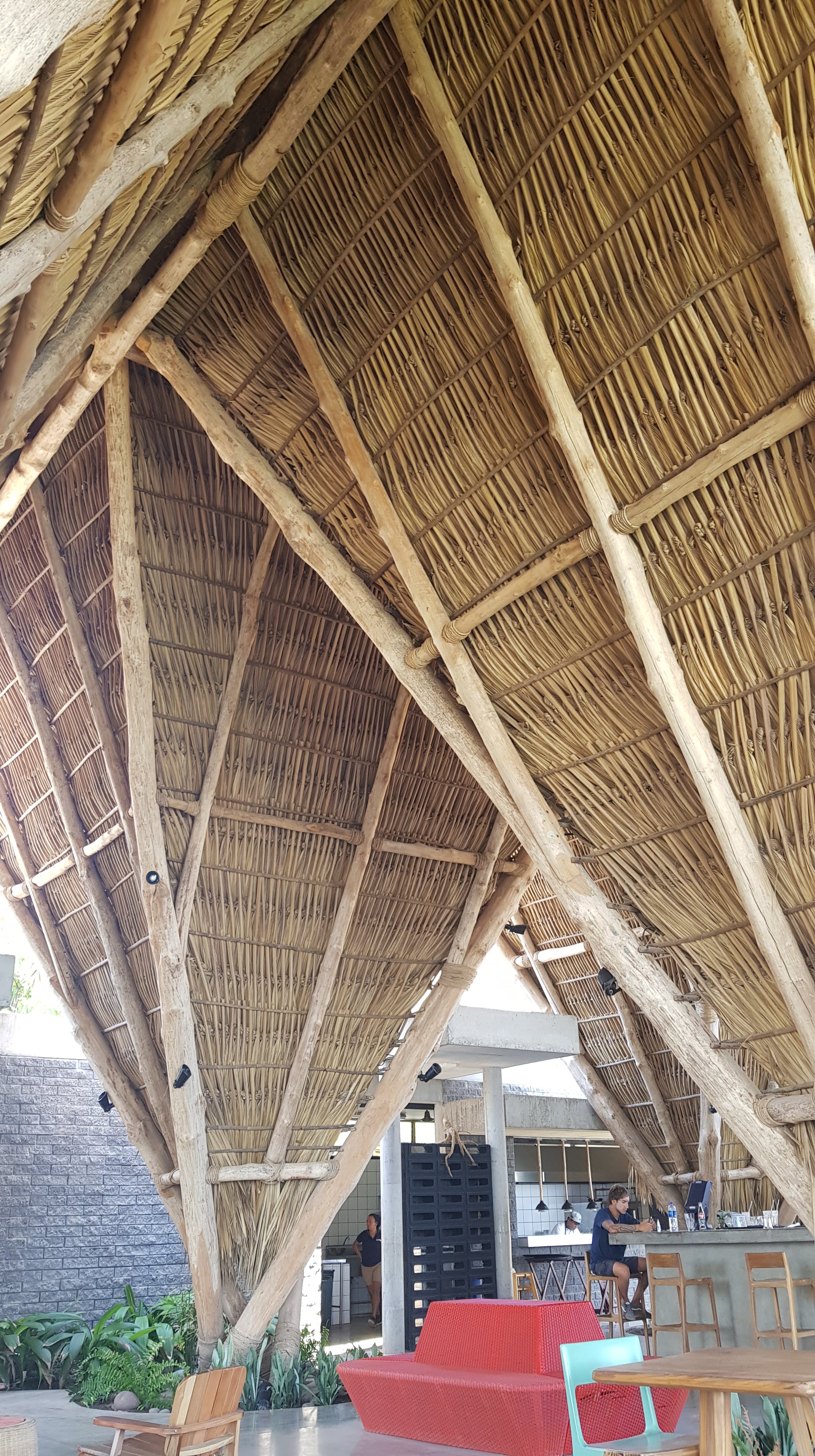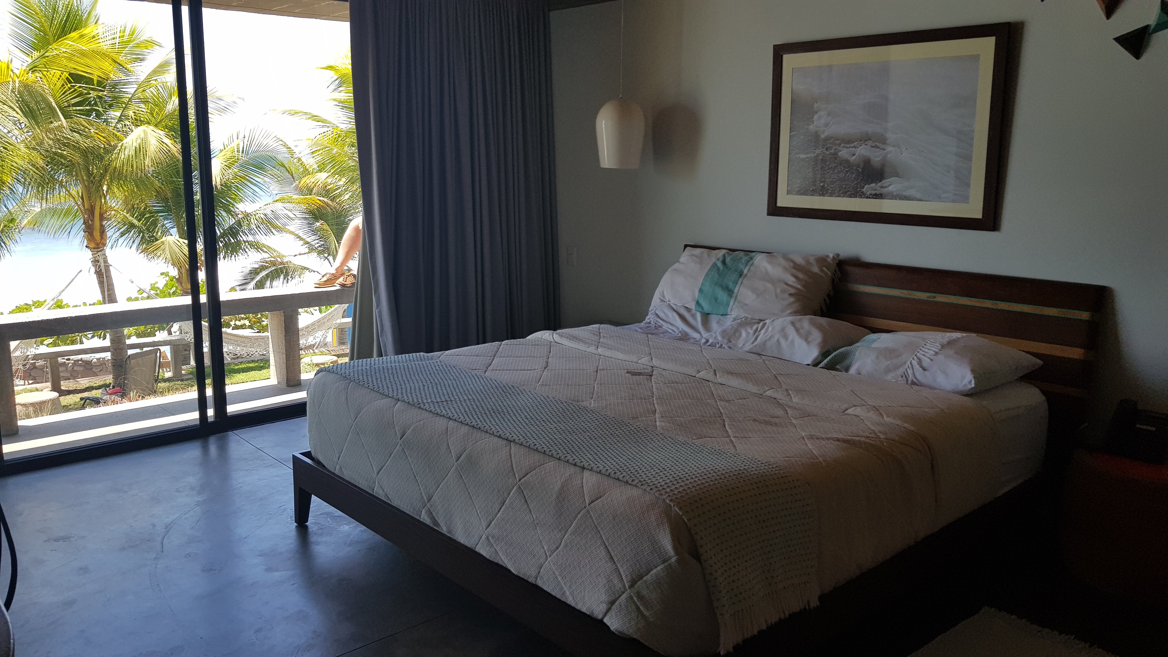 Mais la plus belle des décos, au Puro Surf, est dehors : ciel, sable, eau, palmes, viennent égayer de bleu, de blanc et de vert les modernes bâtiments gris, dont le béton brûle au soleil tropical. D’immenses ouvertures, partout, permettent de profiter de la nature luxuriante qui entoure l’hôtel, de l’horizon maritime qui le borde.