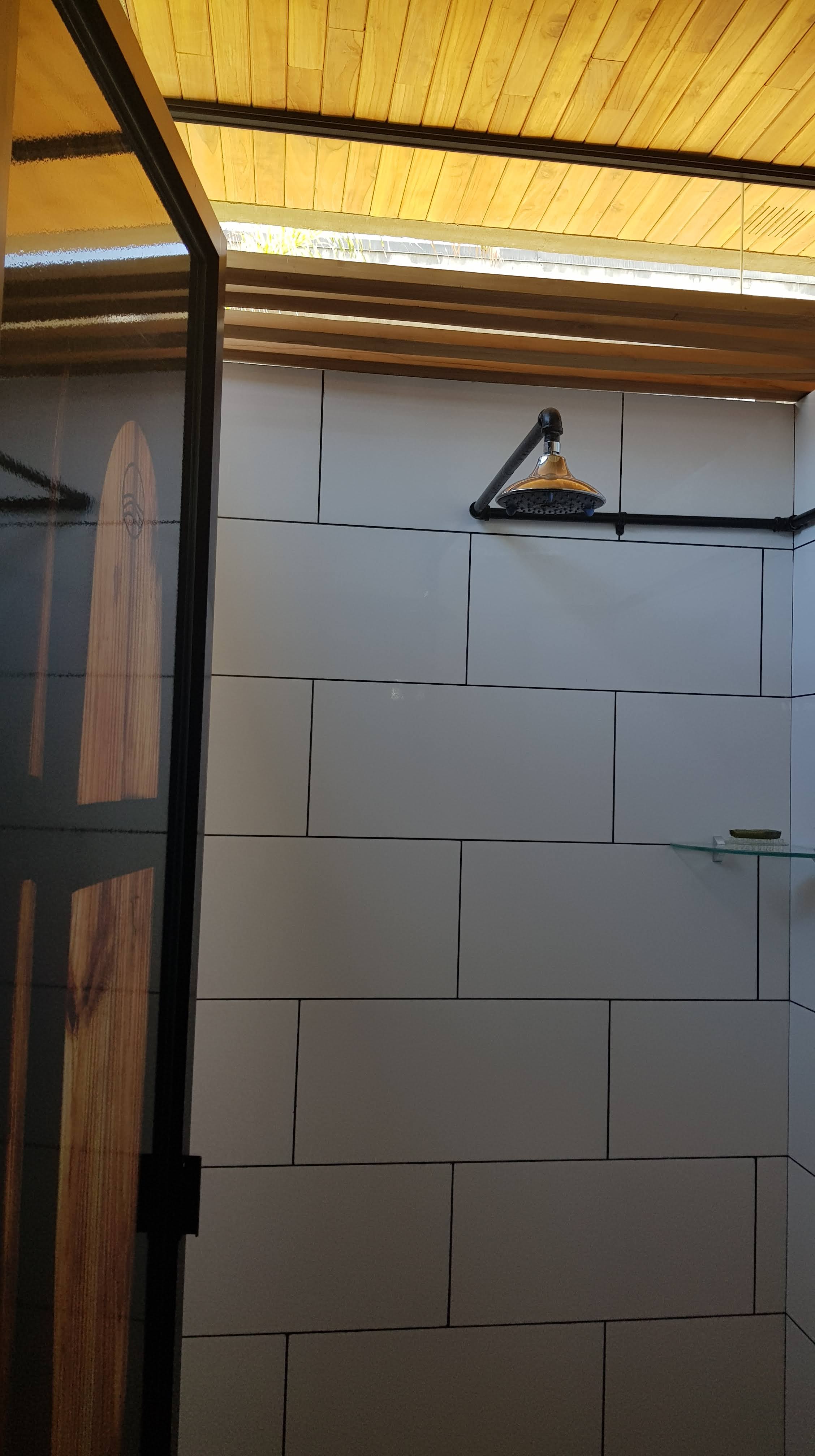 Le confort est ici sportif, et non bourgeois : d’ailleurs, on prend sa douche… en plein air, mais en toute intimité ! Car la belle salle de bains, sobrement revêtue de bois et de béton ciré, est équipée d’une cabine de douche partiellement dépourvue de plafond, laissant entrevoir le ciel – si souvent bleu au Salvador – et s’échapper l’air embué.