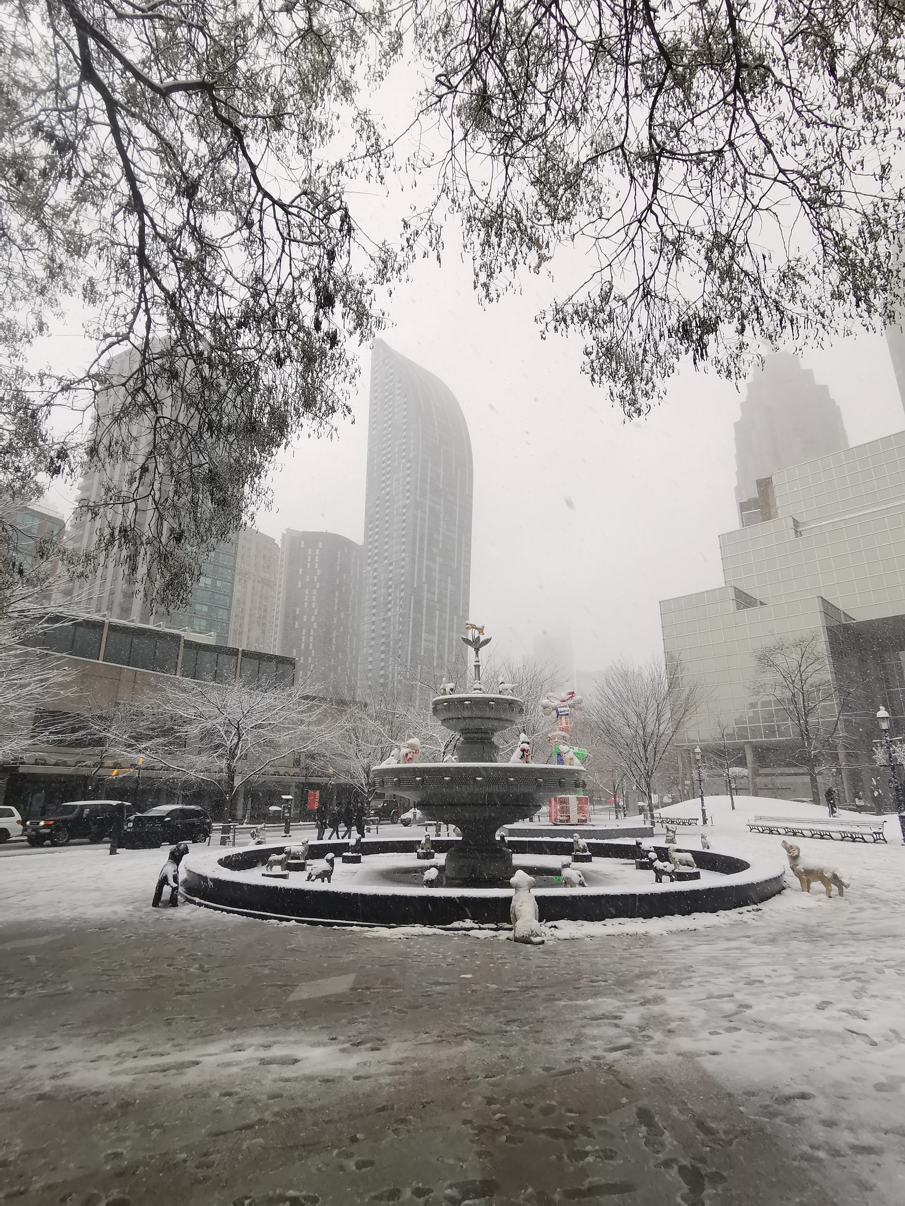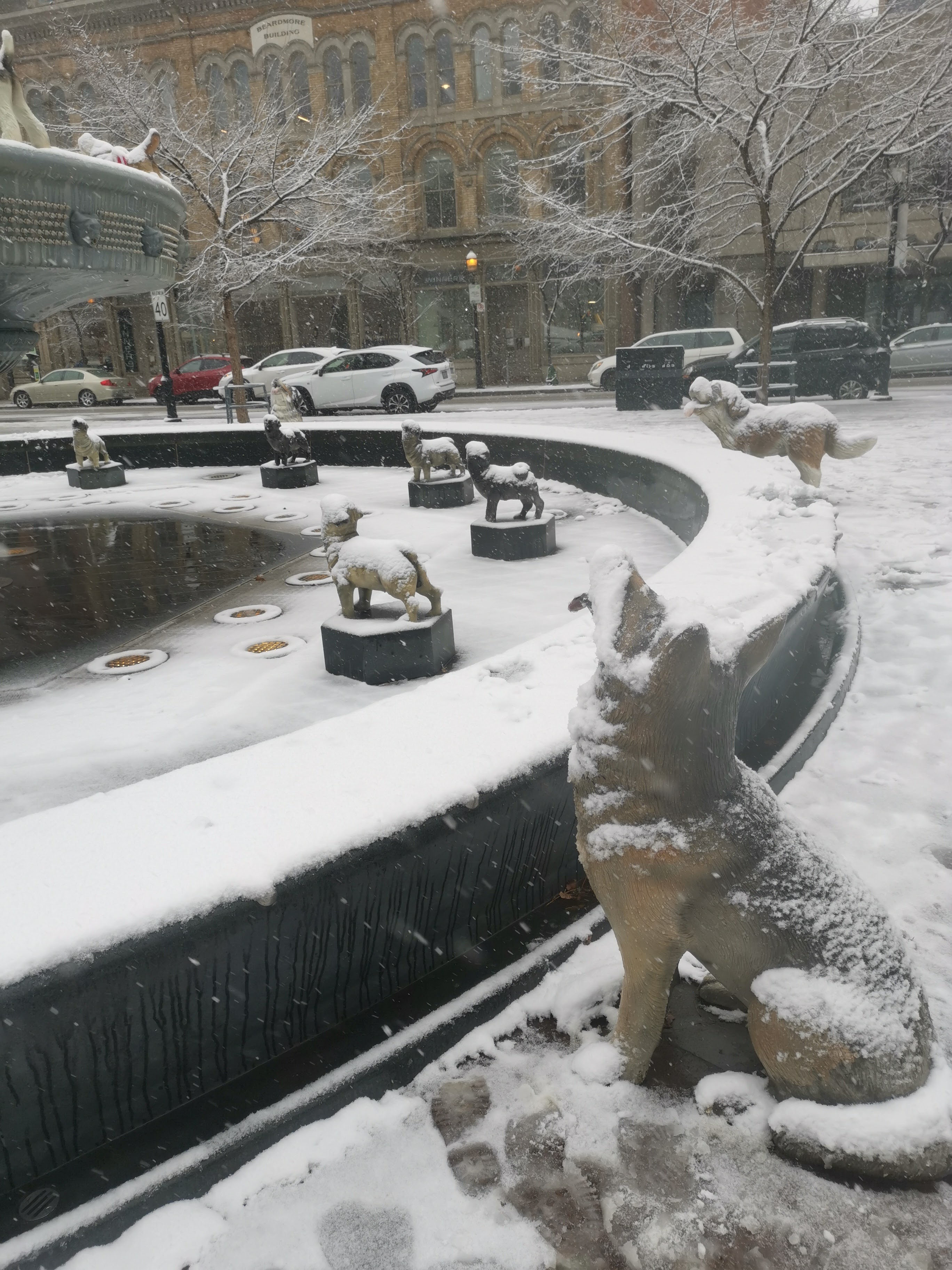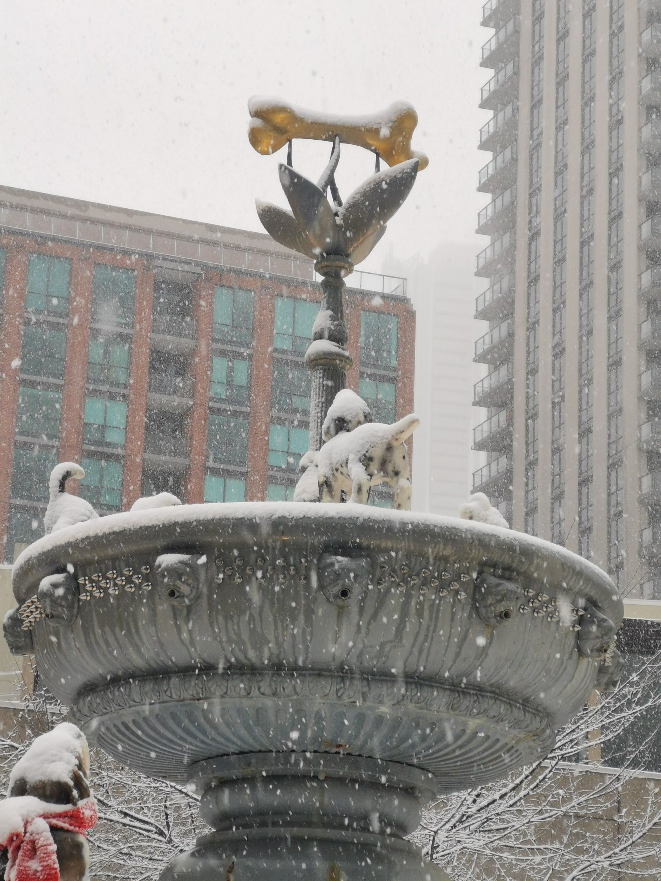 Sous la neige, elle l’est encore plus, attendrissante de laideur naïve sous la beauté immaculée des éléments : une fontaine à chiens et nonos en or… mais qui a bien pu avoir une idée pareille ?