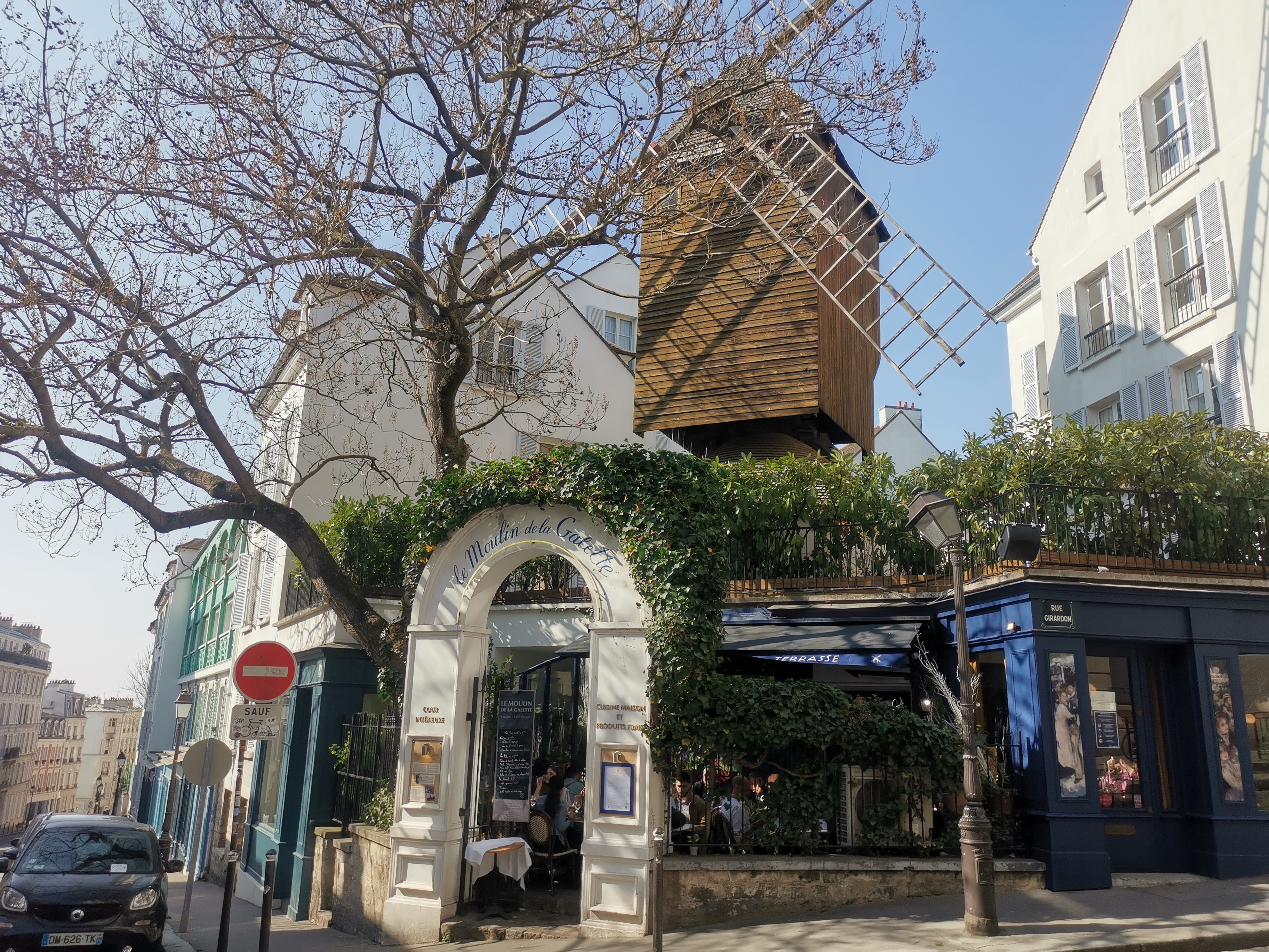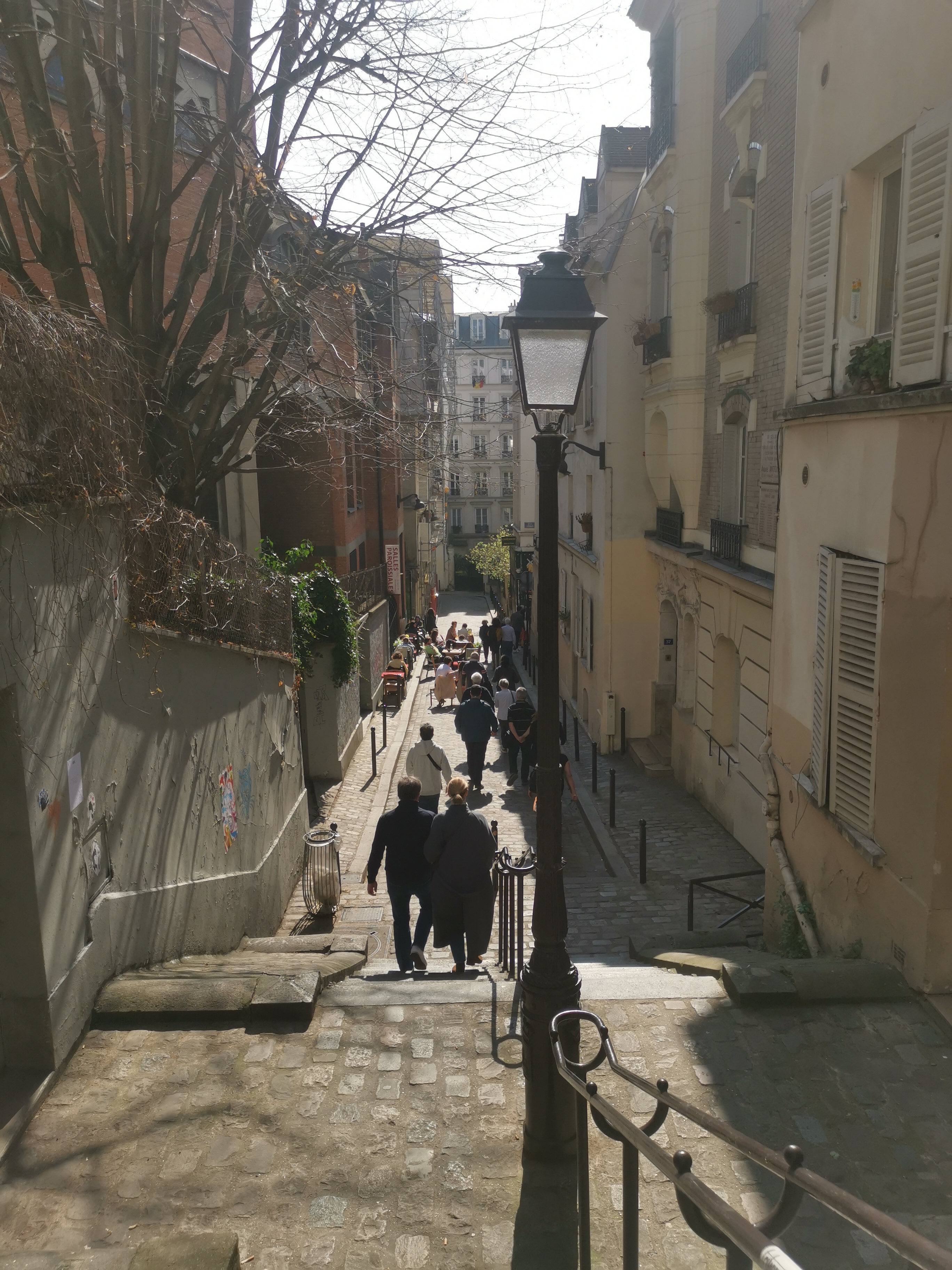 Les touristes se taisent, interloqués, et se mettent à écouter, voire à se rapprocher du petit groupe que promène Anne-Sophie. A capella, sa voix s’impose de façon d’autant plus remarquable dans ce contexte urbain, où elle affronte le bruit des moteurs, la pétarade des scooters, les klaxons et sirènes… et parvient malgré tout à s’imposer dans la foule ! Cette foule qui bientôt s’enroule dans la folle farandole d’Edith Piaf, dont Anne-Sophie convoque bien évidemment le fantôme incontournable, dans ces ruelles où a débuté et grandi la Môme ! Piaf, Brassens, Brel, Aznavour, Dalida, Claude François, ou l’emblématique Aristide Bruant… tous ceux et celles qui ont étrenné leurs voix dans les cabarets du quartier, chanté et vécu sa Bohême, s’y sont enracinés, vous accompagnent dans les escaliers qui grimpent vers la place du Tertre, dans les ruelles qui montent entre les vignes de la Butte, passent devant le Lapin Agile ou le Moulin de la Galette, aboutissent au Sacré Cœur et à sa belle esplanade face à la vue à 360° de Paris. On découvre ou on redécouvre même des chanteurs dont vos enfants, c’est certain, n’auront jamais entendu parler… Ce qui est sûr, c’est qu’avec Anne-Sophie, ils vont adorer la Complainte de la Butte !