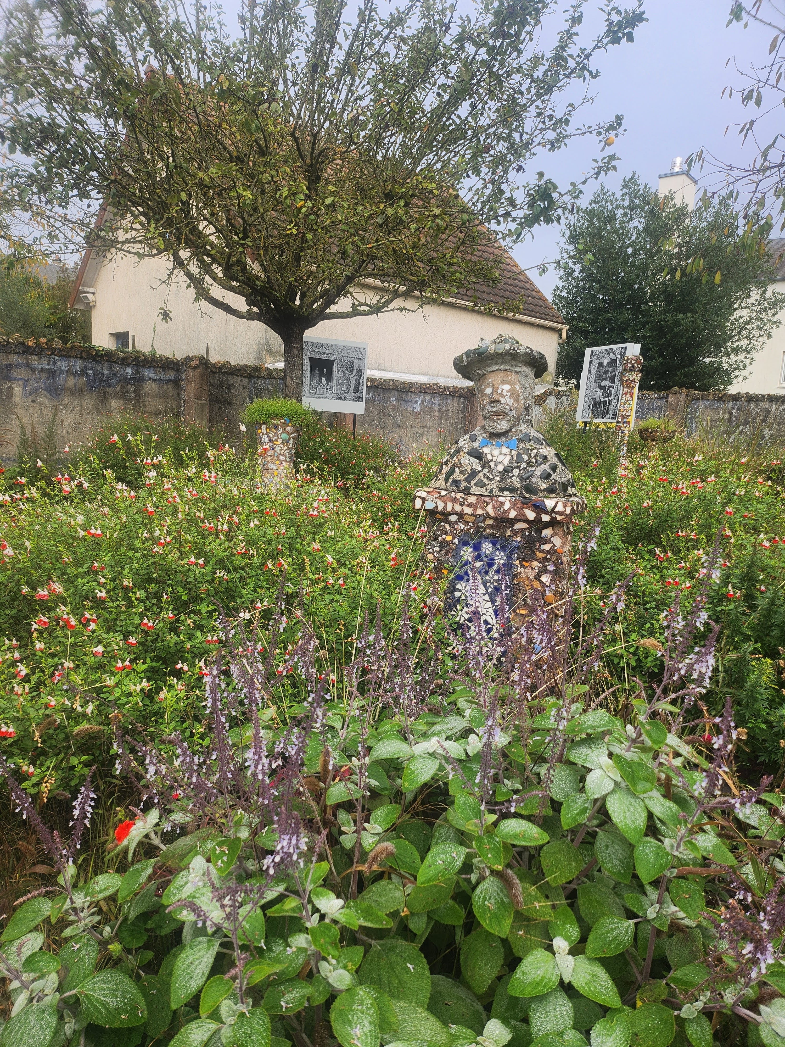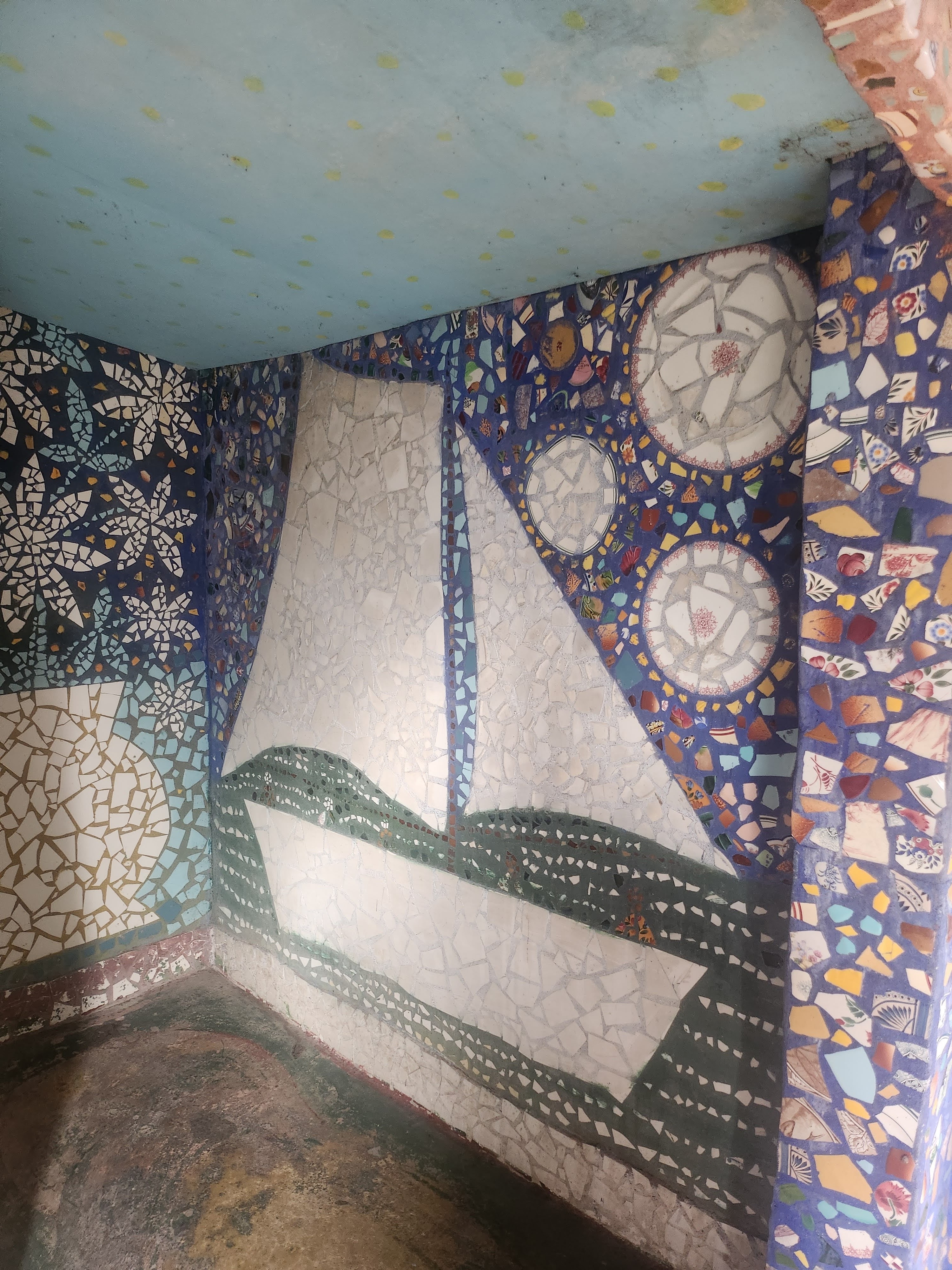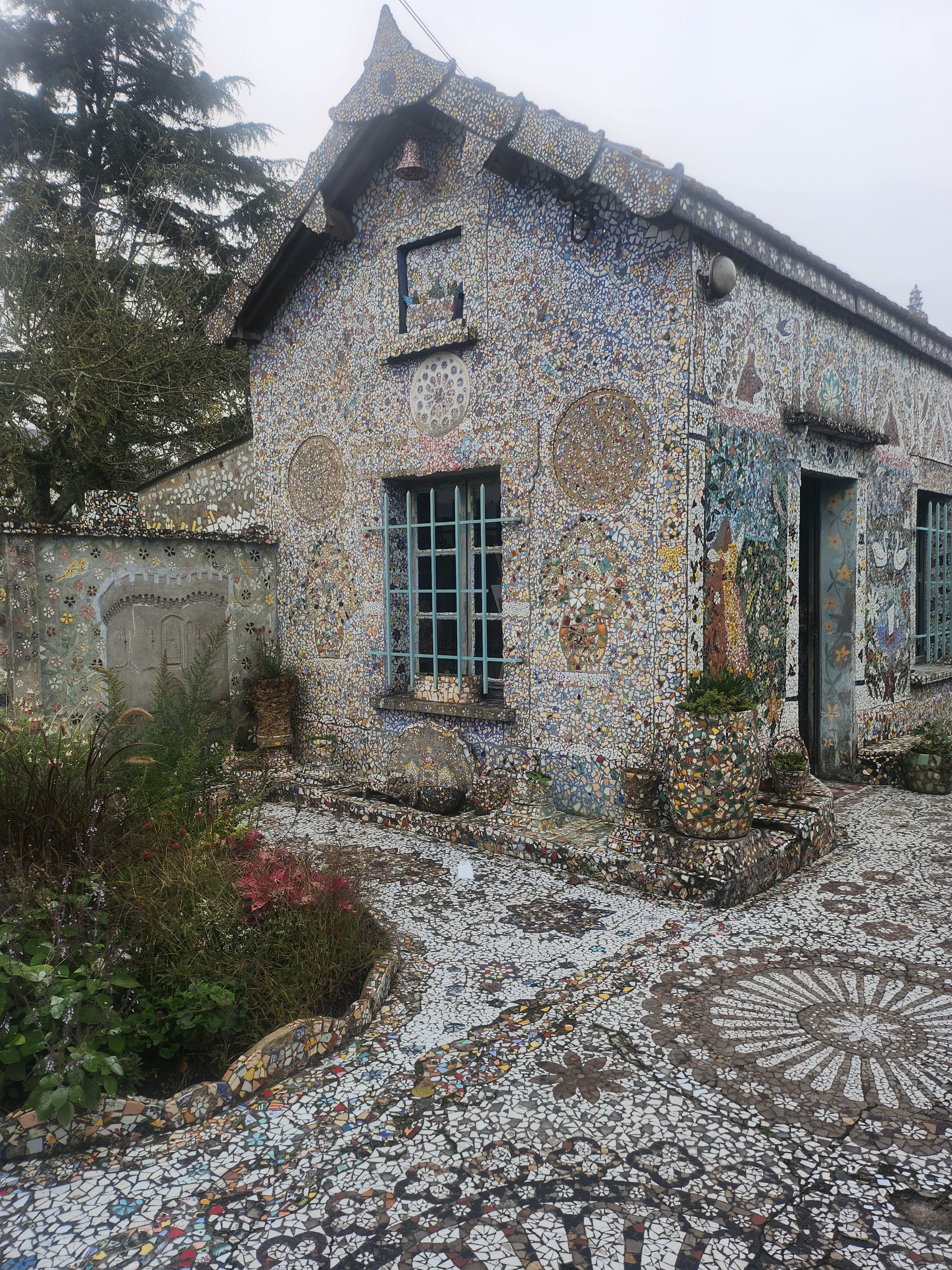 Avec ces éclats d’assiettes, tasses et autres théières (on voit parfois surgir sur les murs les petits becs de ces dernières) il recouvrit entièrement le pavillon qu’il avait bâti de ses mains. Jusque dans le jardin où il aimait planter des fleurs à foison, tout est décoré de cette céramique formant des arabesques et des sculptures multicolores, des roses, des trônes et des statues, recouvrant même le mobilier, du lit jusqu’à la machine à coudre de madame Isidore ! Celle-ci racontait qu’elle craignait de s’éveiller un matin recouverte entièrement de mosaïque ! Un peu fou, son mari, certes… mais attentionné : il planta des fleurs à foison dans le jardin de la maison, parce que son épouse les aimait ! Et parce que, comme ses créations de céramique, elles mettent de la couleur, de la beauté, du bonheur, dans ce monde qui en manque… Raymond Isidore, dont on peut lire des citations affichées dans le jardin, et qui finit ses jours en hôpital psychiatrique, était un humaniste angoissé, en quête d’idéal et d’une solution au malheur.