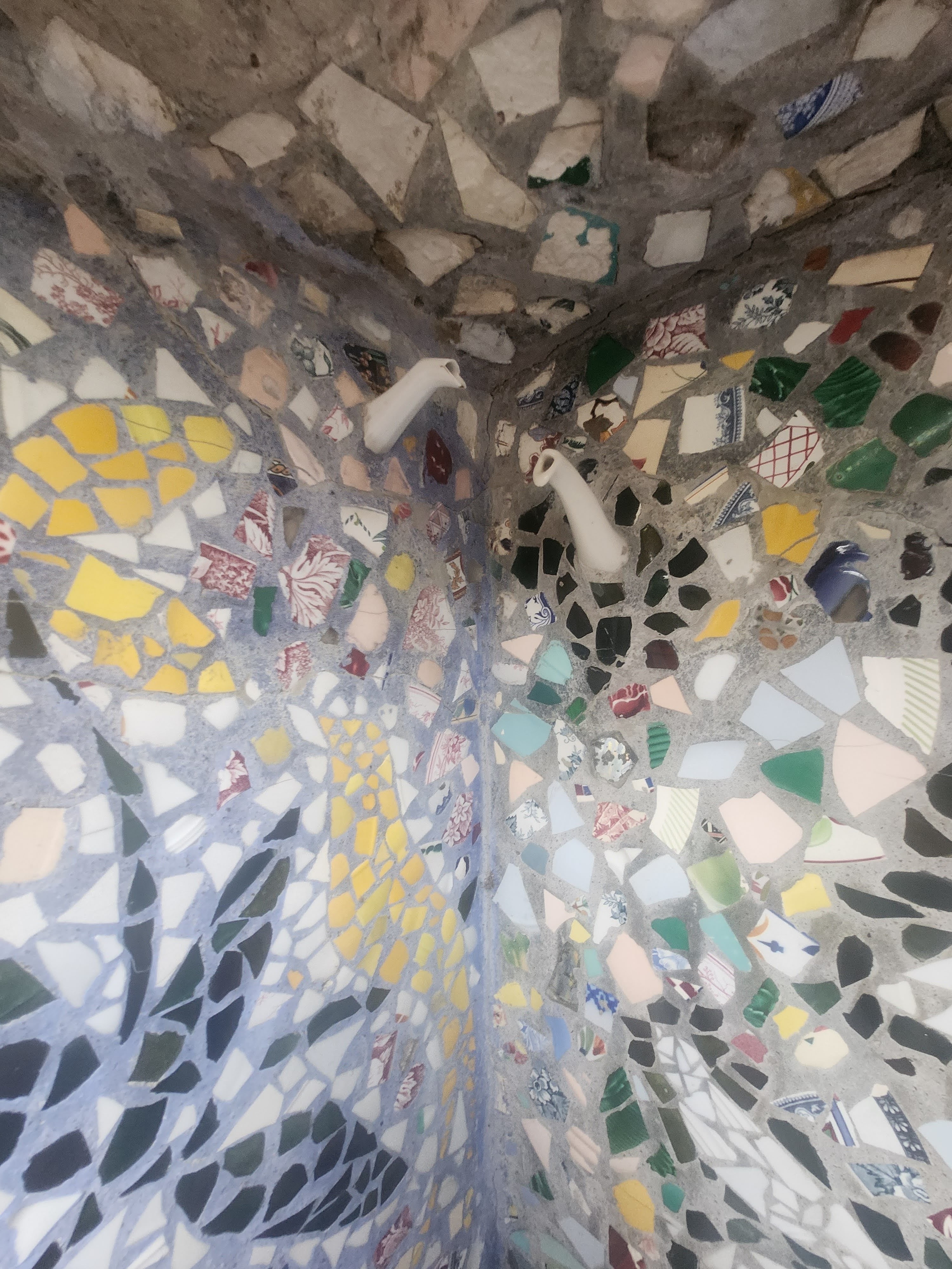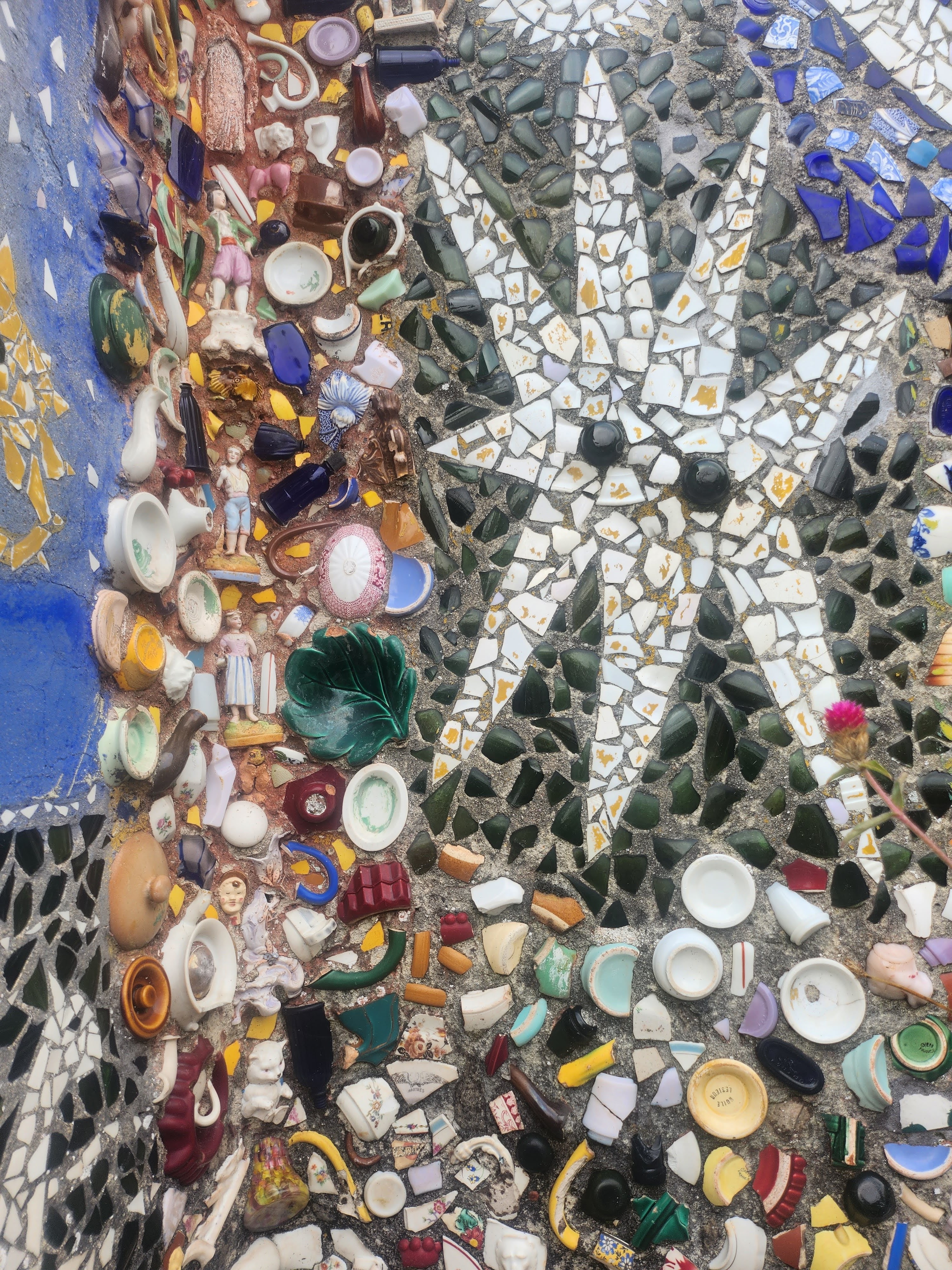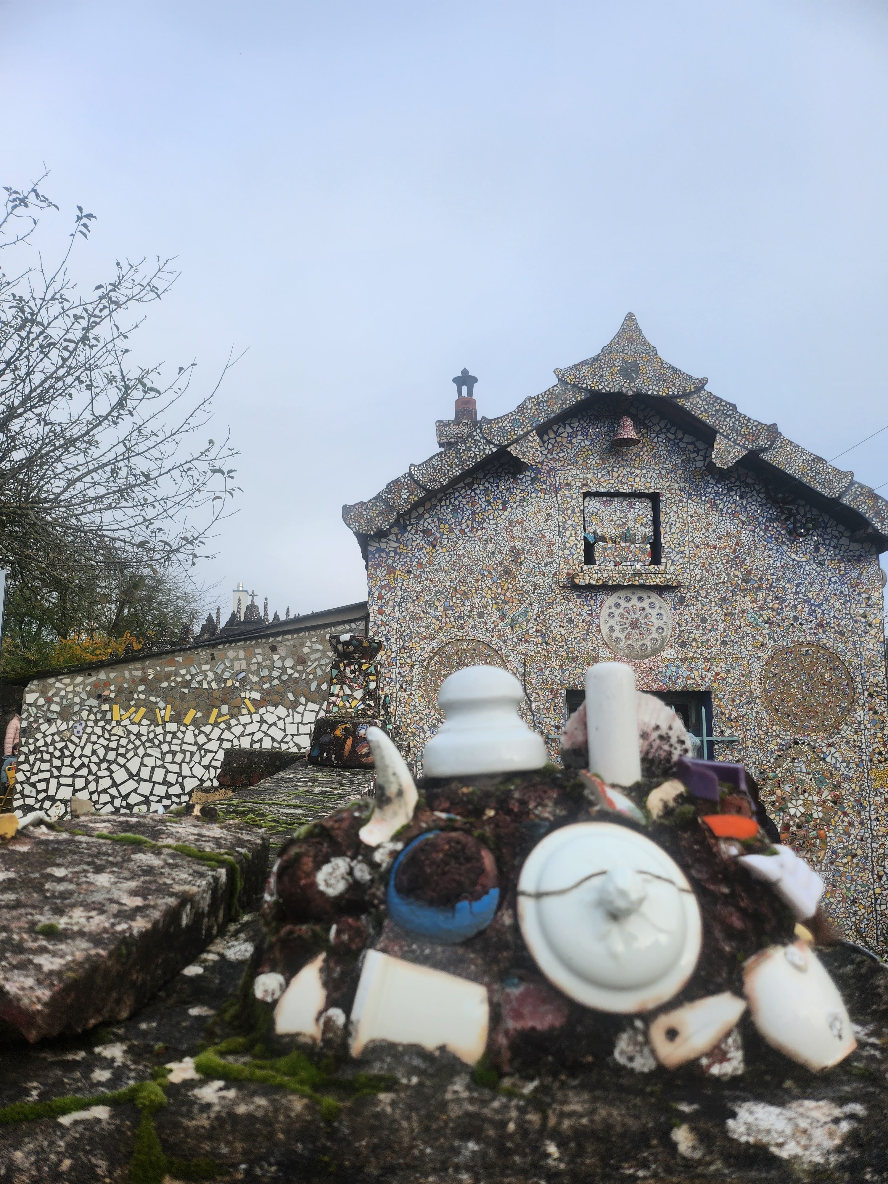 Avec ces éclats d’assiettes, tasses et autres théières (on voit parfois surgir sur les murs les petits becs de ces dernières) il recouvrit entièrement le pavillon qu’il avait bâti de ses mains. Jusque dans le jardin où il aimait planter des fleurs à foison, tout est décoré de cette céramique formant des arabesques et des sculptures multicolores, des roses, des trônes et des statues, recouvrant même le mobilier, du lit jusqu’à la machine à coudre de madame Isidore ! Celle-ci racontait qu’elle craignait de s’éveiller un matin recouverte entièrement de mosaïque ! Un peu fou, son mari, certes… mais attentionné : il planta des fleurs à foison dans le jardin de la maison, parce que son épouse les aimait ! Et parce que, comme ses créations de céramique, elles mettent de la couleur, de la beauté, du bonheur, dans ce monde qui en manque… Raymond Isidore, dont on peut lire des citations affichées dans le jardin, et qui finit ses jours en hôpital psychiatrique, était un humaniste angoissé, en quête d’idéal et d’une solution au malheur.