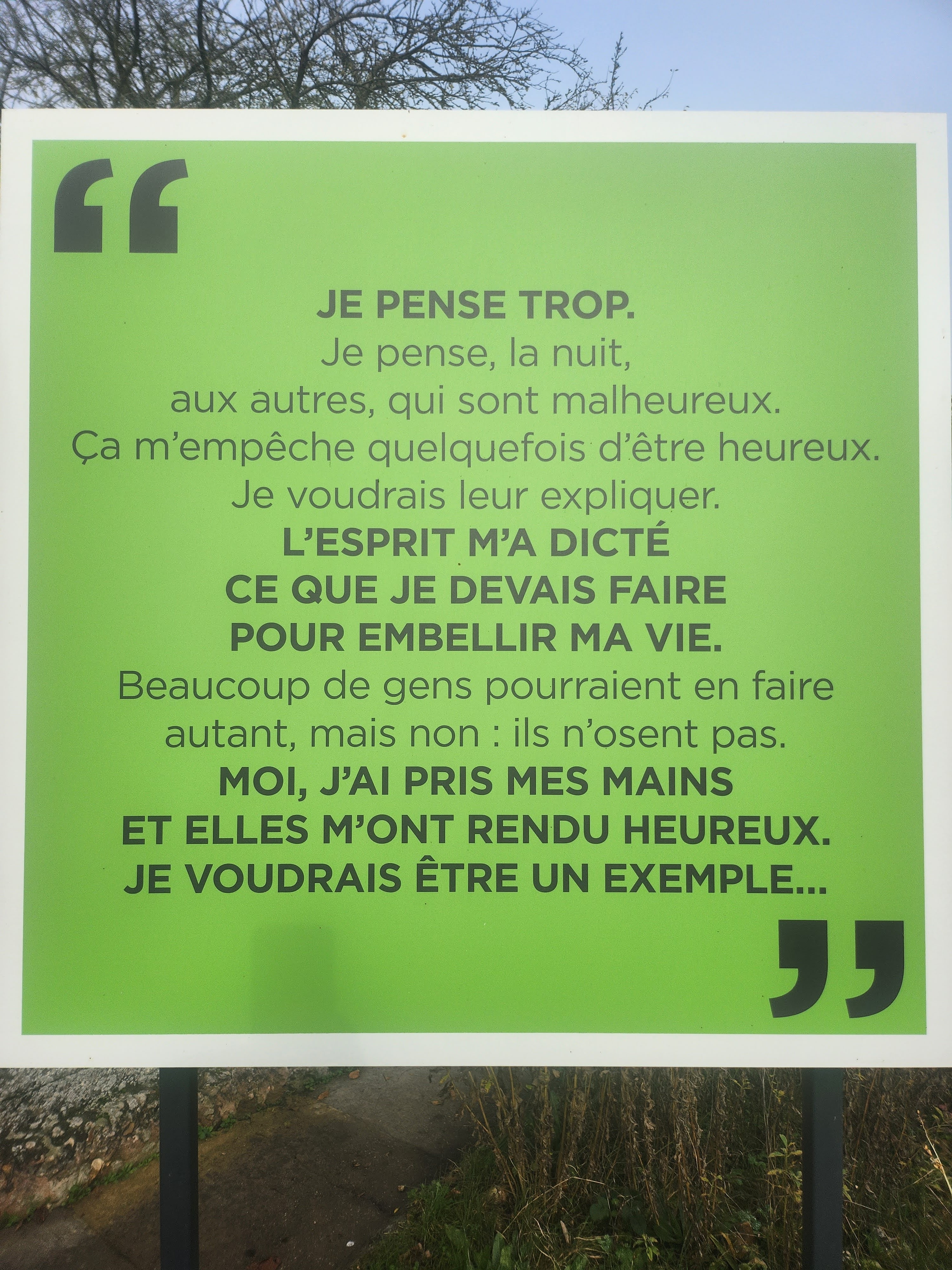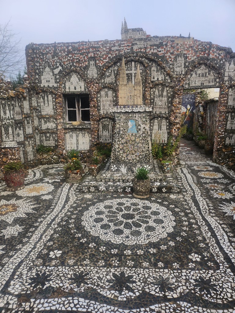 C’était enfin un rêveur éveillé, qui donnait forme, le jour, à ses visions nocturnes, et ceci sans jamais avoir pris le moindre cours de dessin ni de scuplture. Comme s’il avait été touché par la grâce de l’art, lui qui était aussi imprégné de religion et a reproduit minutieusement en mosaïques la cathédrale de Chartres, ou créé des statues en hommage à Marie.