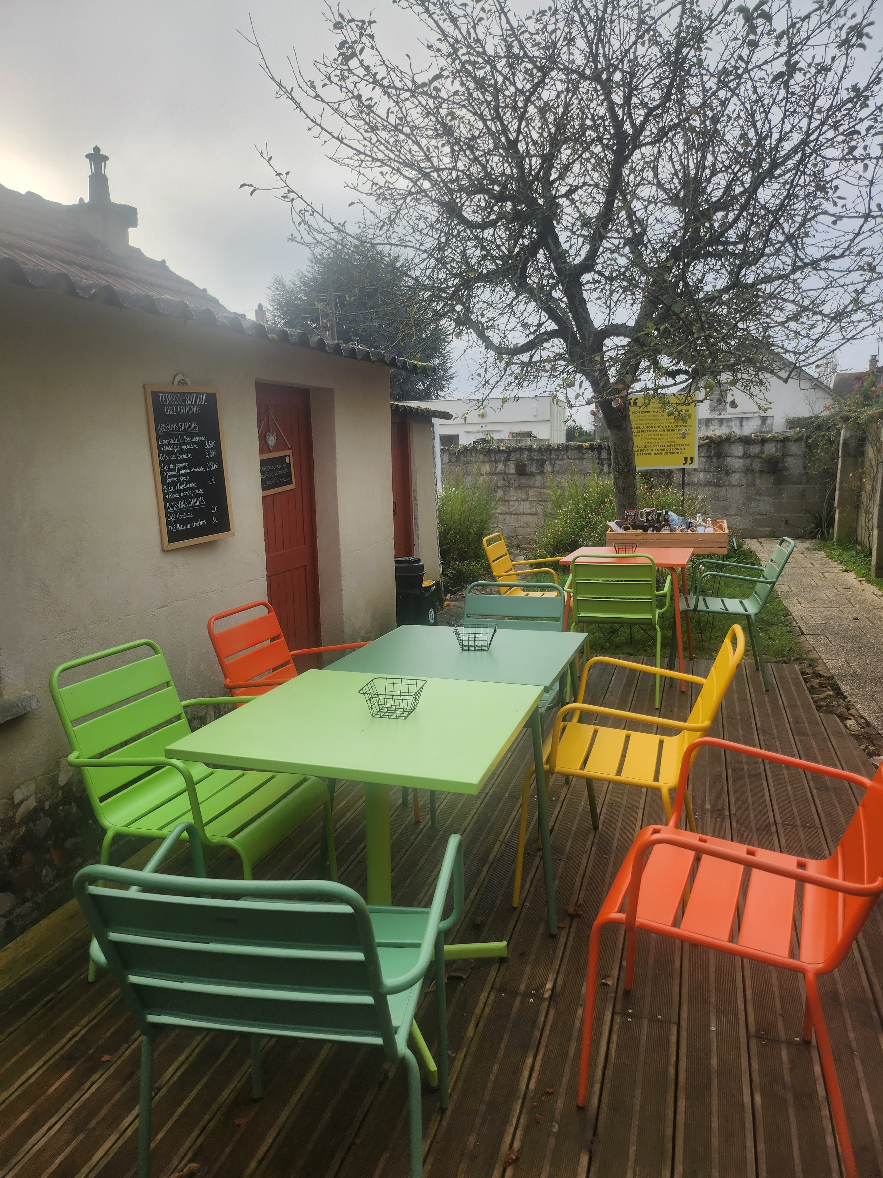 Un petit bistrot très sympa en sortant, tout à fait dans l’esprit Picassiette avec ses chaises colorées et ses tasses accrochées aux branches des arbres !
