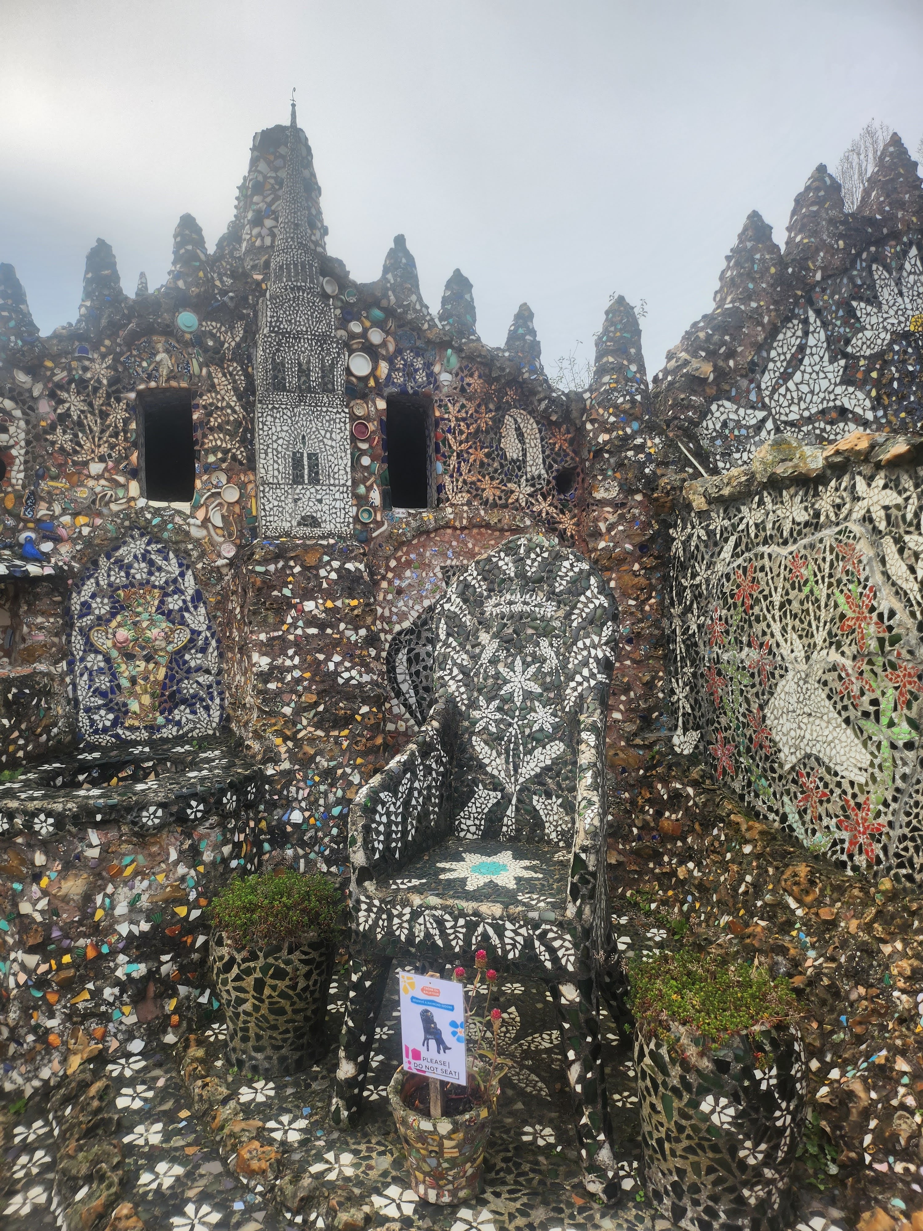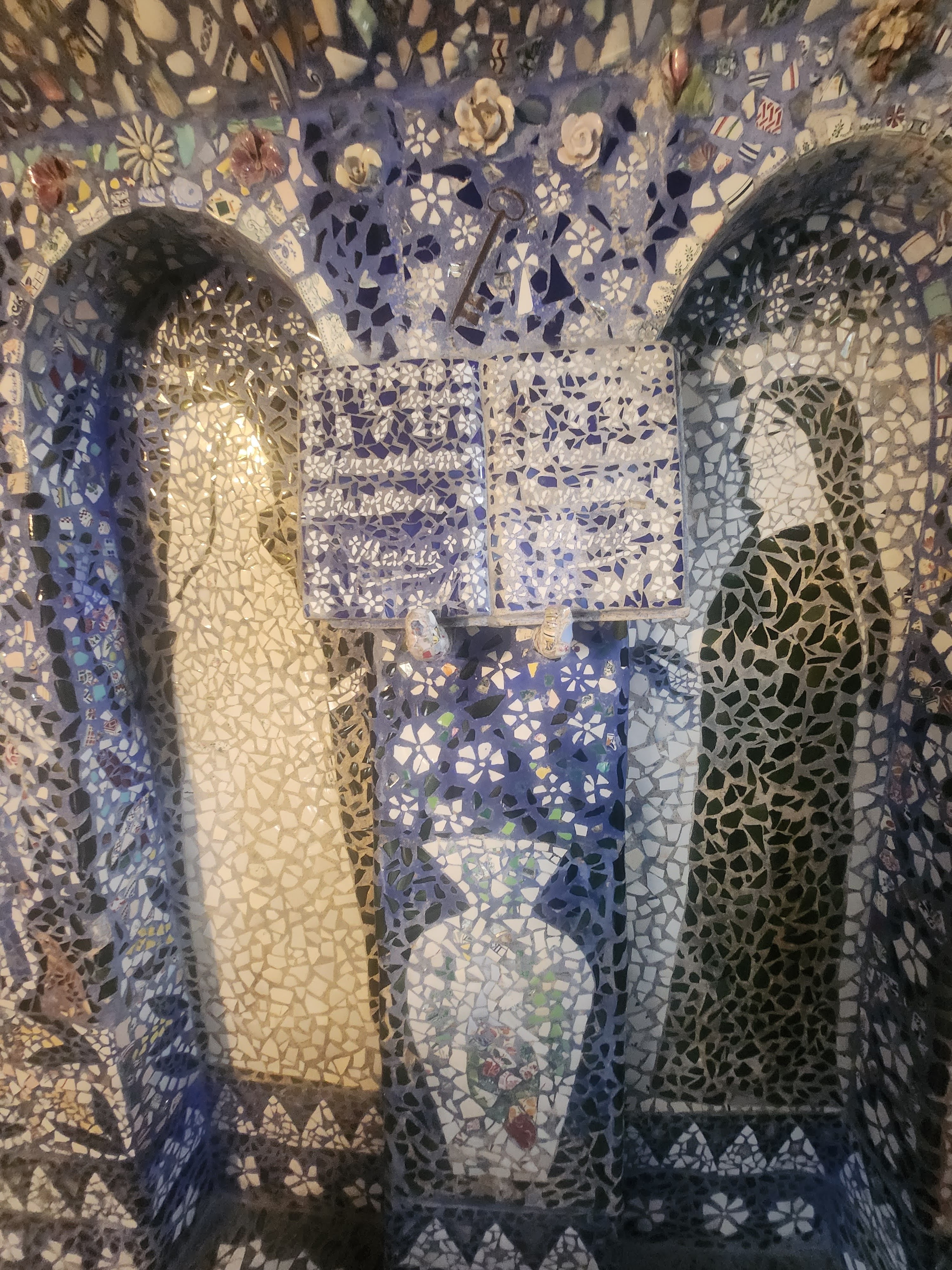 Avec ces éclats d’assiettes, tasses et autres théières (on voit parfois surgir sur les murs les petits becs de ces dernières) il recouvrit entièrement le pavillon qu’il avait bâti de ses mains. Jusque dans le jardin où il aimait planter des fleurs à foison, tout est décoré de cette céramique formant des arabesques et des sculptures multicolores, des roses, des trônes et des statues, recouvrant même le mobilier, du lit jusqu’à la machine à coudre de madame Isidore ! Celle-ci racontait qu’elle craignait de s’éveiller un matin recouverte entièrement de mosaïque ! Un peu fou, son mari, certes… mais attentionné : il planta des fleurs à foison dans le jardin de la maison, parce que son épouse les aimait ! Et parce que, comme ses créations de céramique, elles mettent de la couleur, de la beauté, du bonheur, dans ce monde qui en manque… Raymond Isidore, dont on peut lire des citations affichées dans le jardin, et qui finit ses jours en hôpital psychiatrique, était un humaniste angoissé, en quête d’idéal et d’une solution au malheur.
